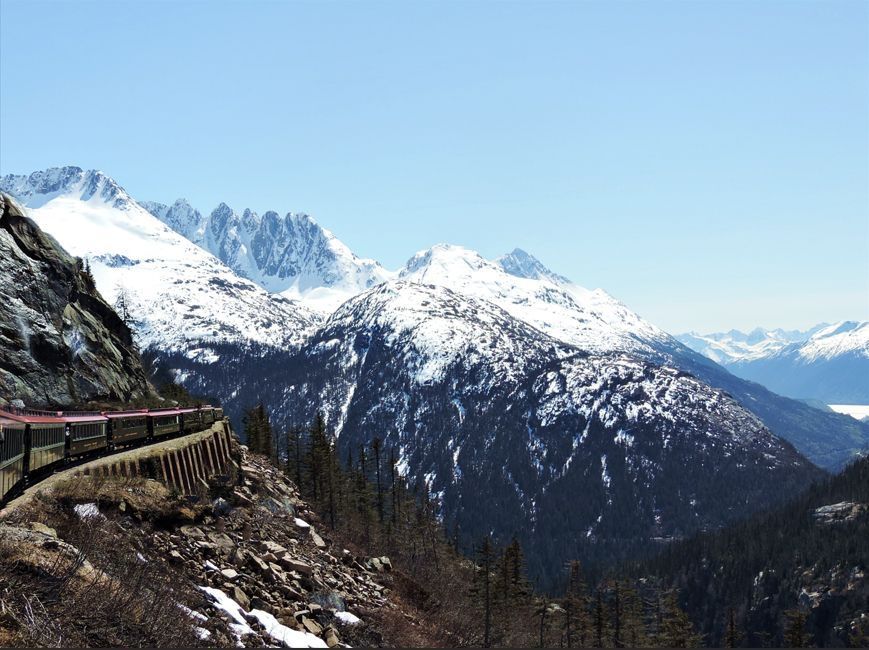A red-roofed train passes out of view to the left of a snowy peaked mountain rangeMade/Created