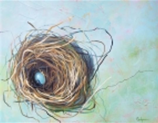 A lone blue egg rests in a cream and tan nest with a black thread woven through out. The nest registers lower left on a textured background of blue, green, and pink.Made/Created
