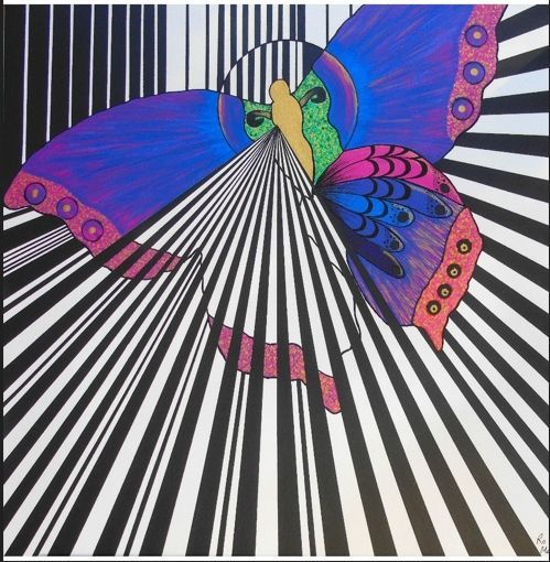 On a black and white striped background, a purple and blue butterfly rises to the left. the stripes of the back ground radiate out from the center of the butterfly's yellow body, covering the lower half of the left wing. The area of the wings still visible are green surrounding the body turning to a blue and magenta blend edged in speckled pink with purple circles.Made/Created