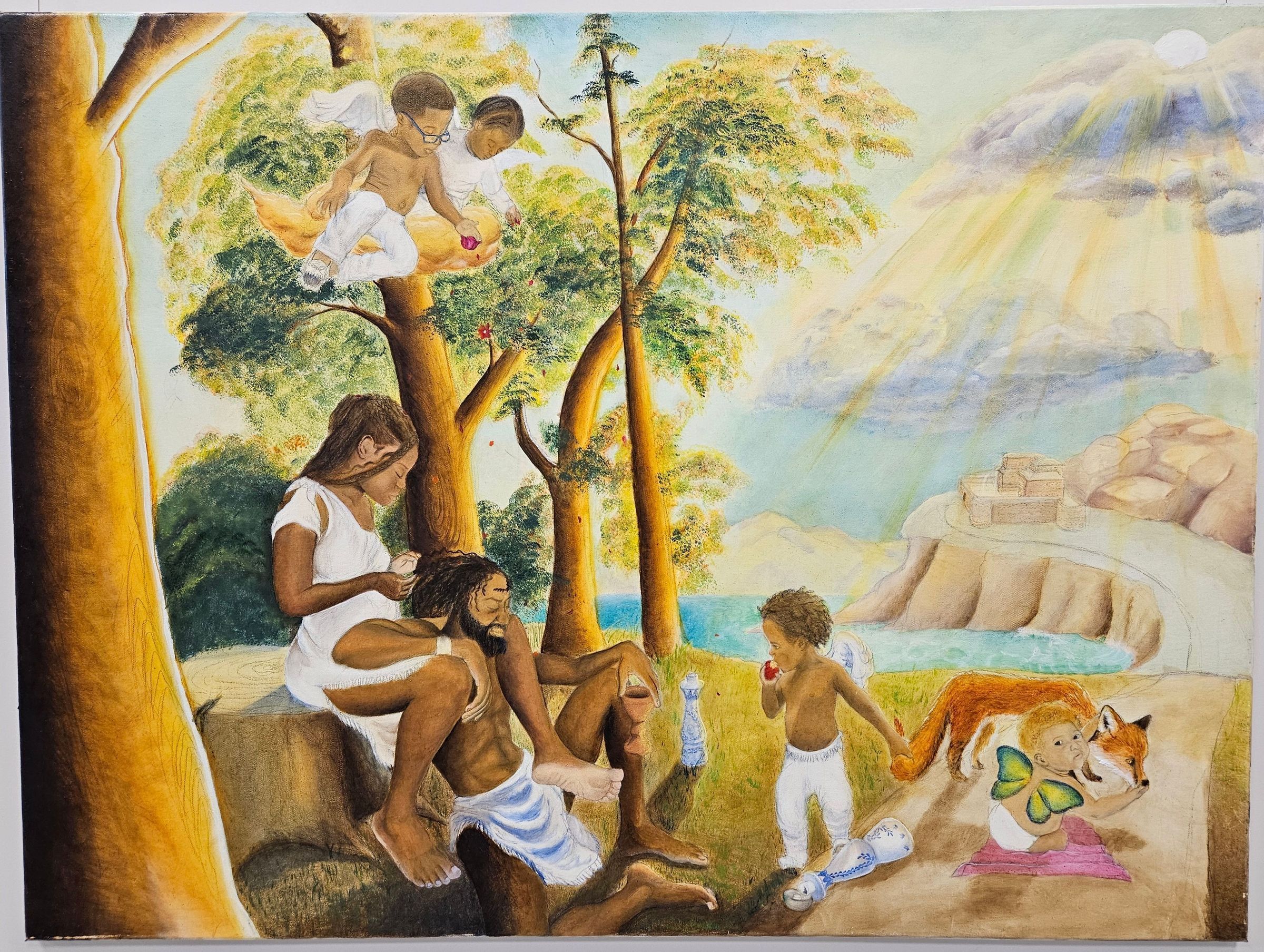 The background depicts a sun shining through clouds onto a fantastical kingdom overlooking a body of water. In the foreground there are 6 figures and a fox. Two winged children ride a golden cloud, one winged child plays with a fox and stares at the viewer, while the other winged child holds onto the fox's tail and eats and apple. The two adult figures are seated. One female and one male. The male figure braids the hair of the male figure. All figures are dressed in whiteMade/Created