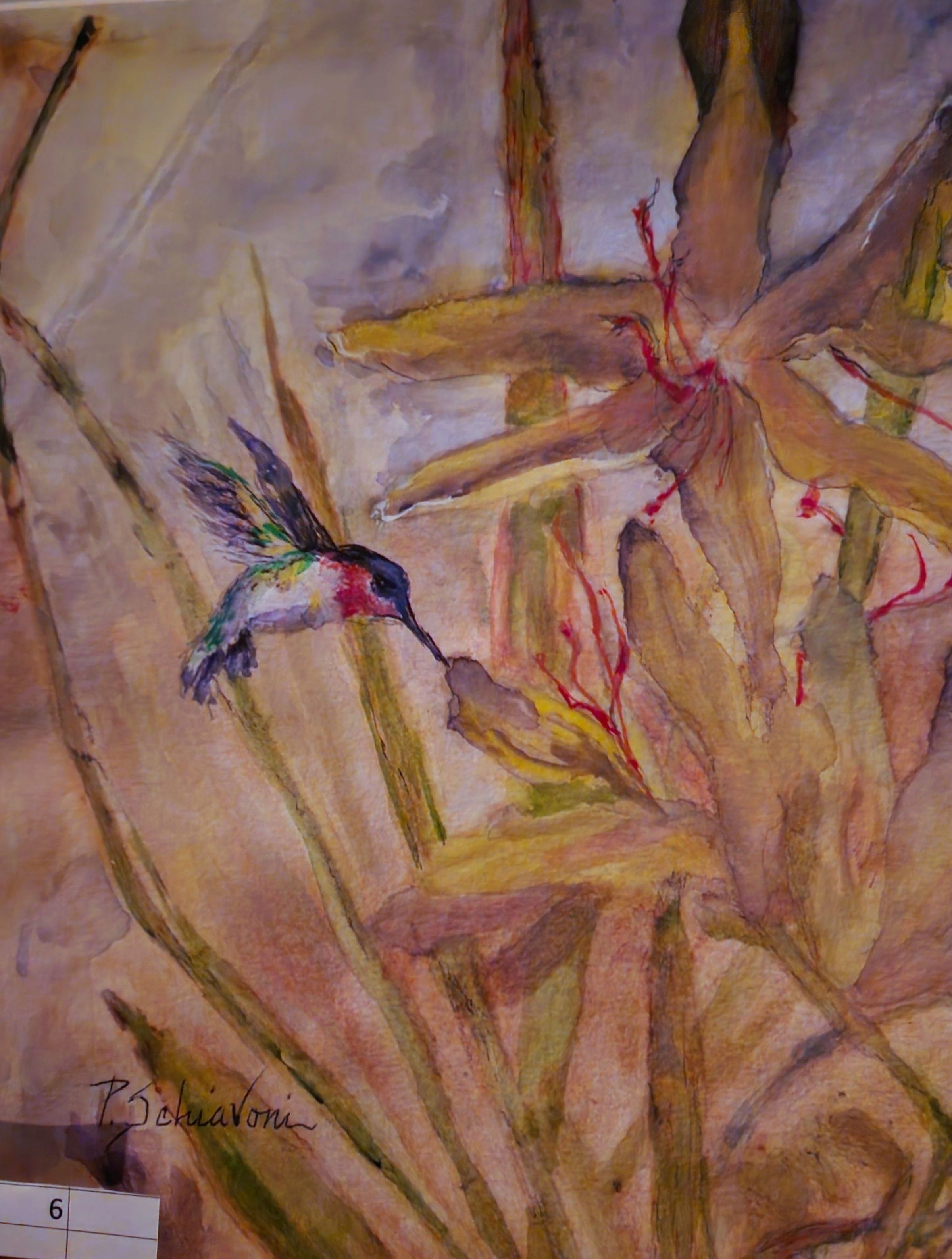 Abstract scene of daylilies and a hummingbird.Artwork Details