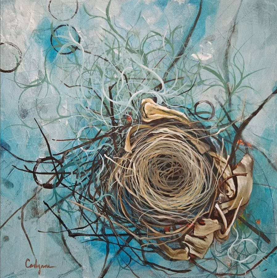 A nest of tan straw, white whisps, a few hints of red, and Spanish moss sits in the lower right corner on a light blue and white backgroundMade/Created