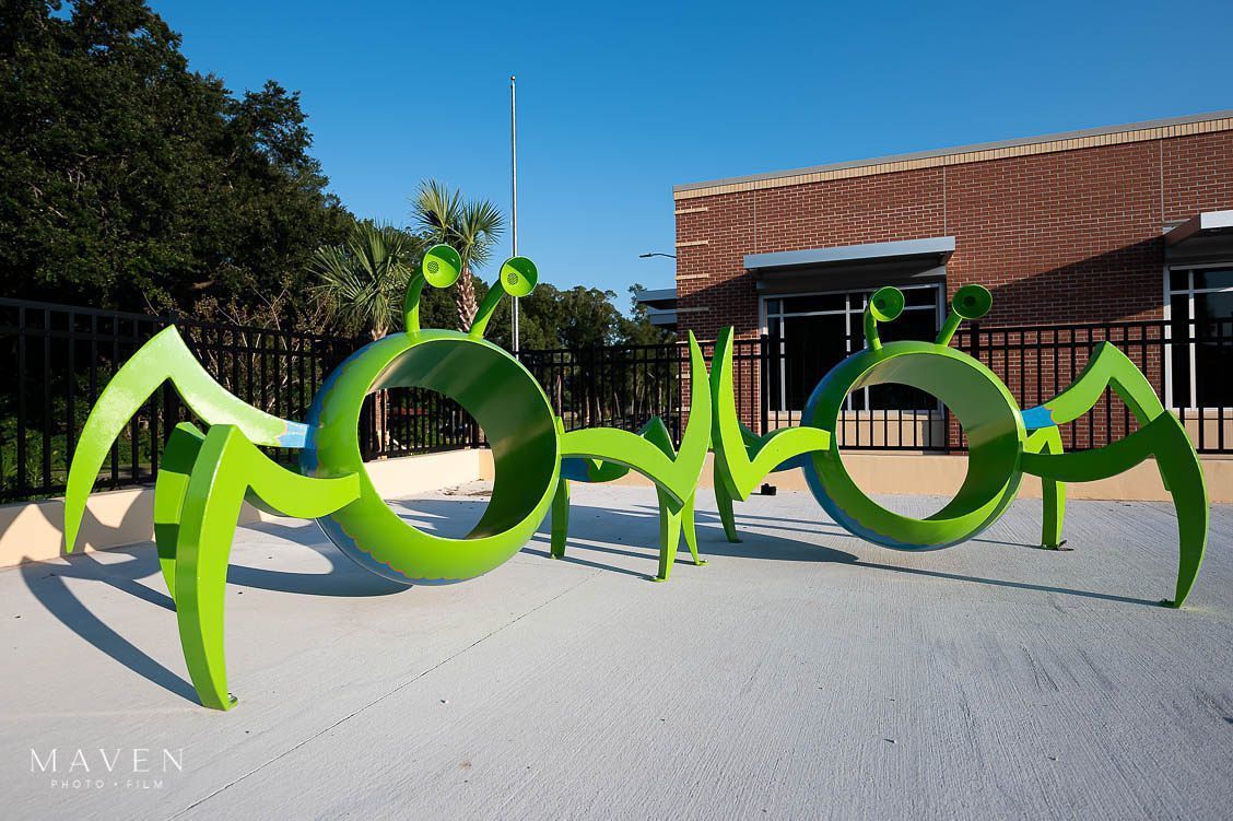3 green hollow bugs that allow whispering through the antennae or climbing and crawling through the center, and a green bench with a telephone pipe.Acquisition