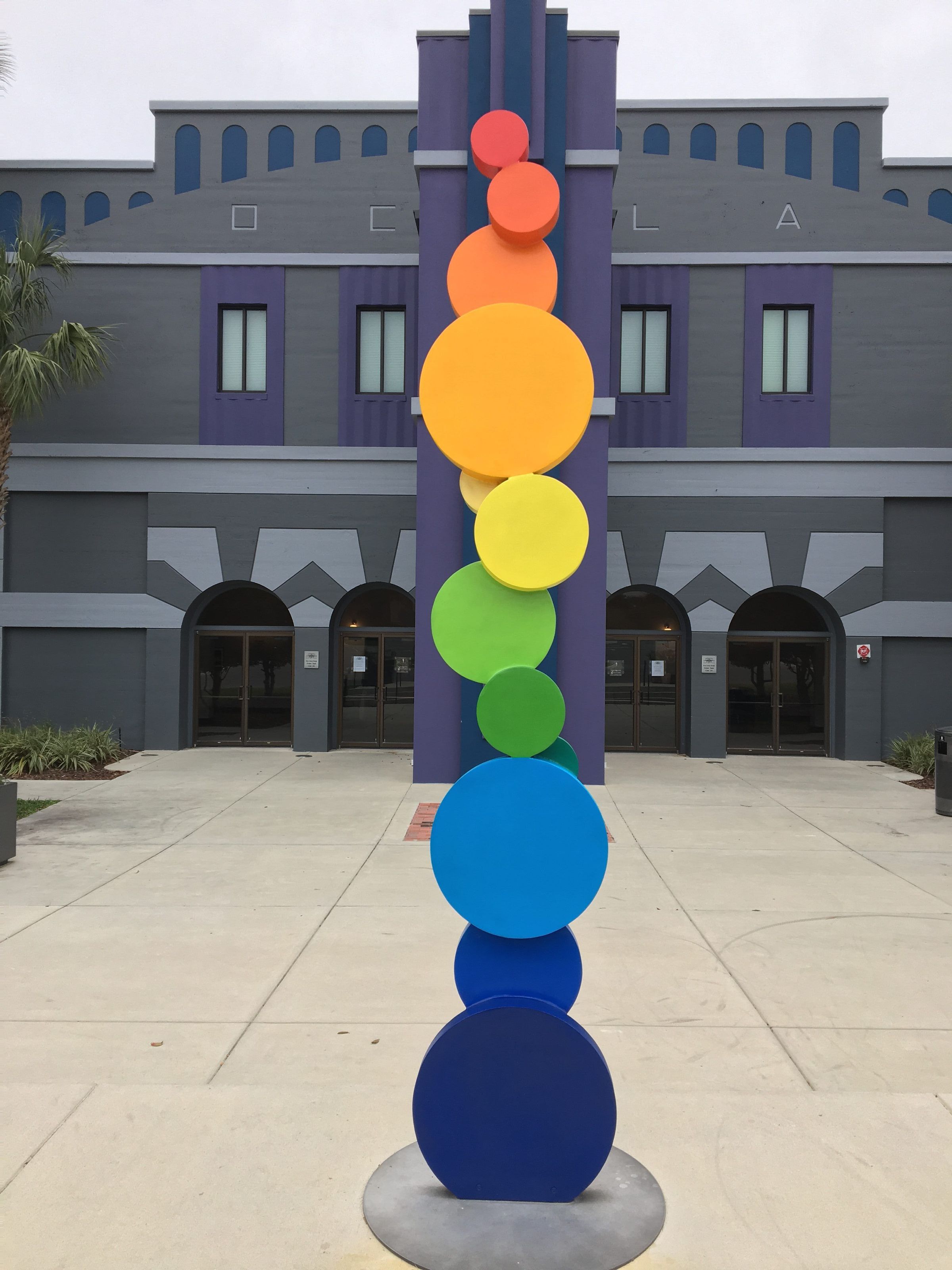 Series of 11 discs of various sized stacked vertically in chromatic color order with red on the top.