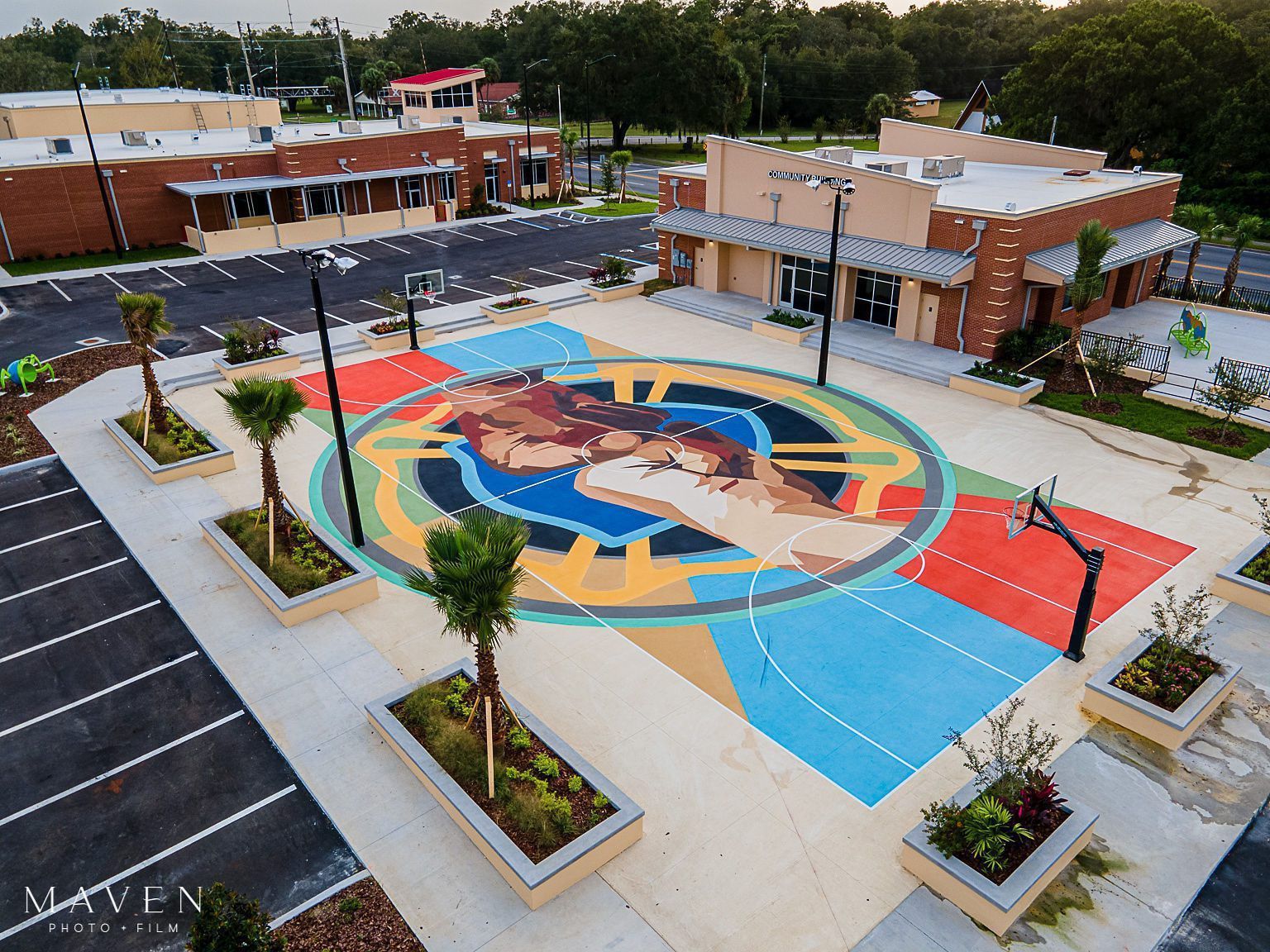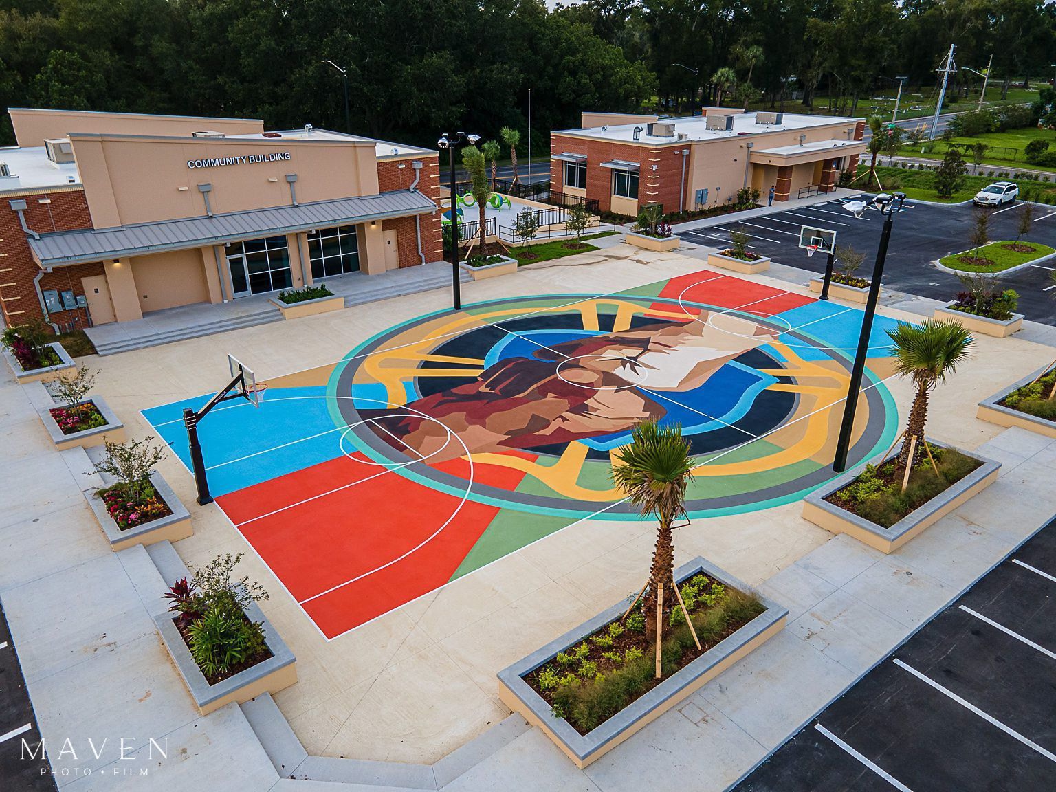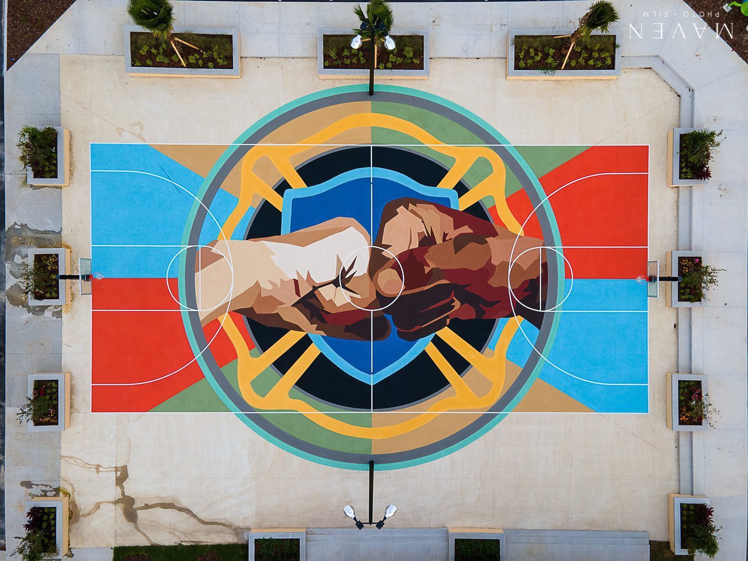 The concept for Common Grounds draws on imagery, symbols and color palate relating to First Responders and the City of Ocala. The primary focal point of the artwork is an illustration of two hands engaged in a common greeting known as a “fist bump”, surrounded by representations of the seals associated with First Responders.