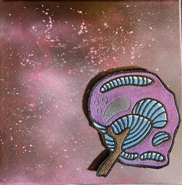 An abstract mushroom embroidery in purple, blue, and grey rests on the lower right corner of a maroon background speckled with white.Exhibitions