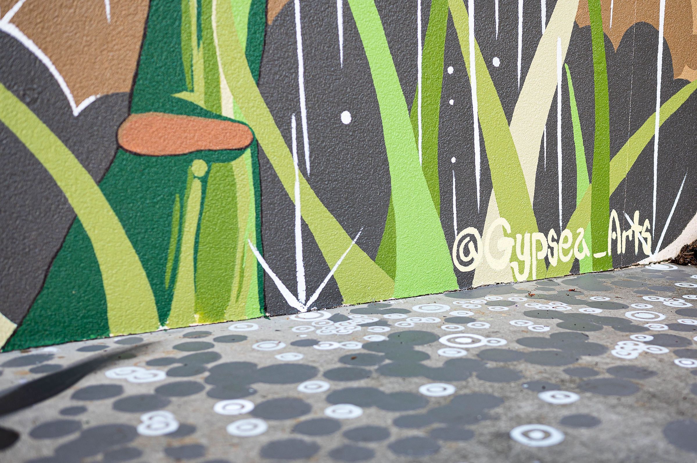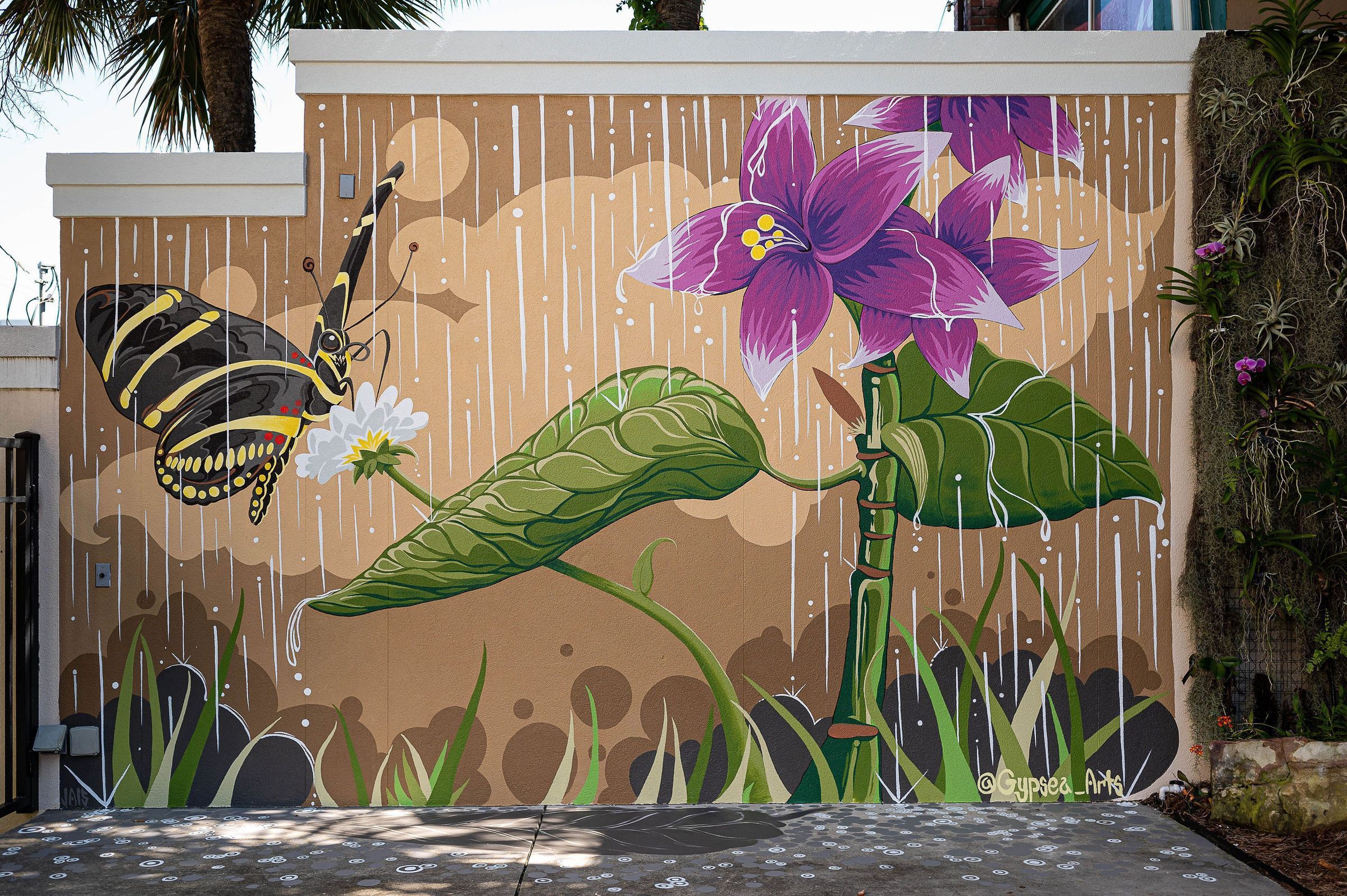 Mural depicting flowers and a butterfly in the rain.Artwork Details