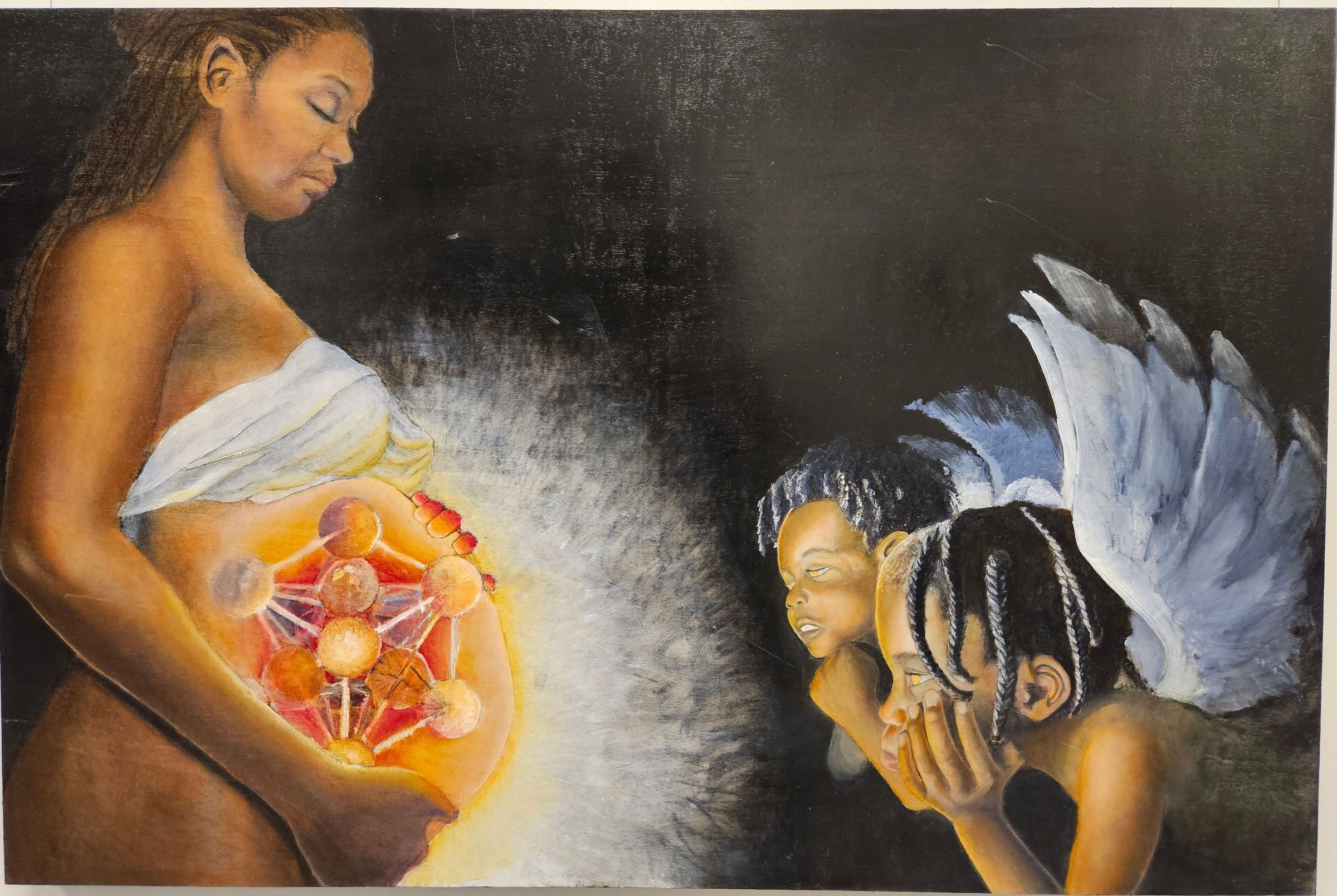 A pregnant female figure stands at the left. Light shines through her belly and two winged children stare in wonder.