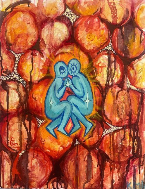 Two figures in blue facing each other and holding hands on a red and yellow background of orbs