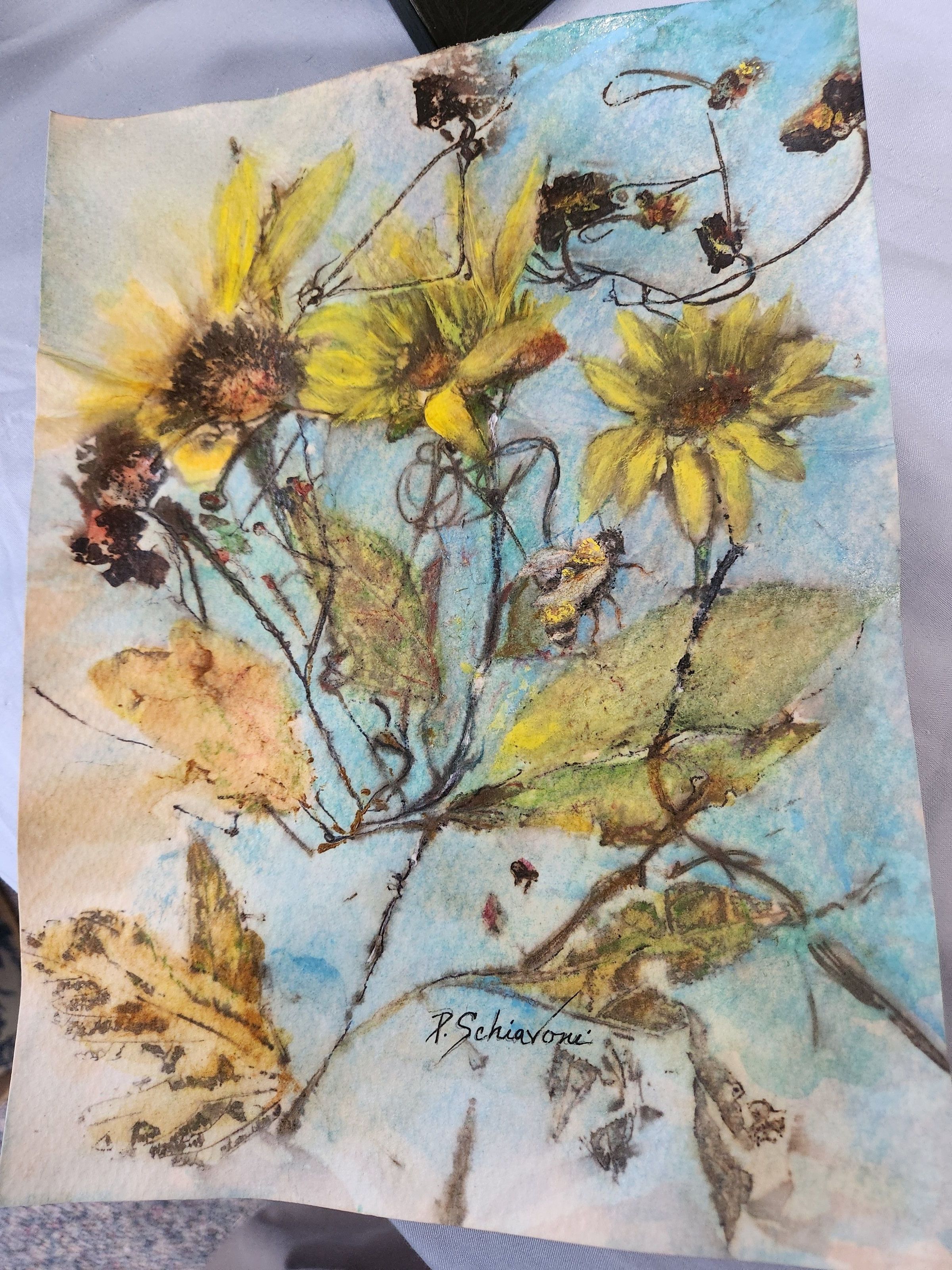 Abstract scene of a bumblebee, Mexican Sunflowers, and other botanicals.Artwork Details