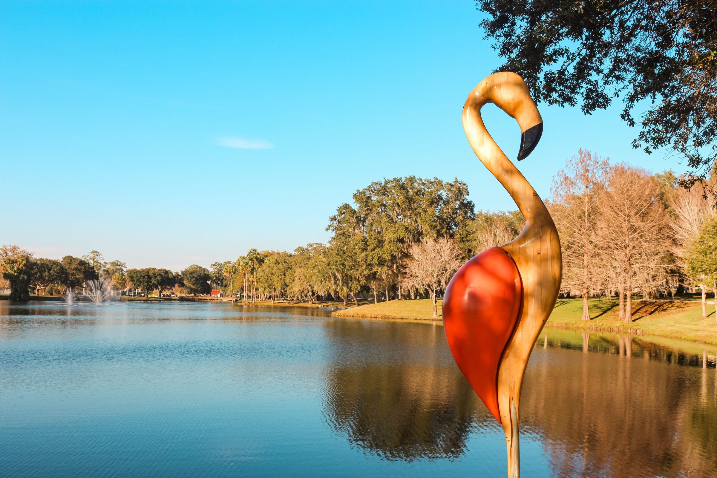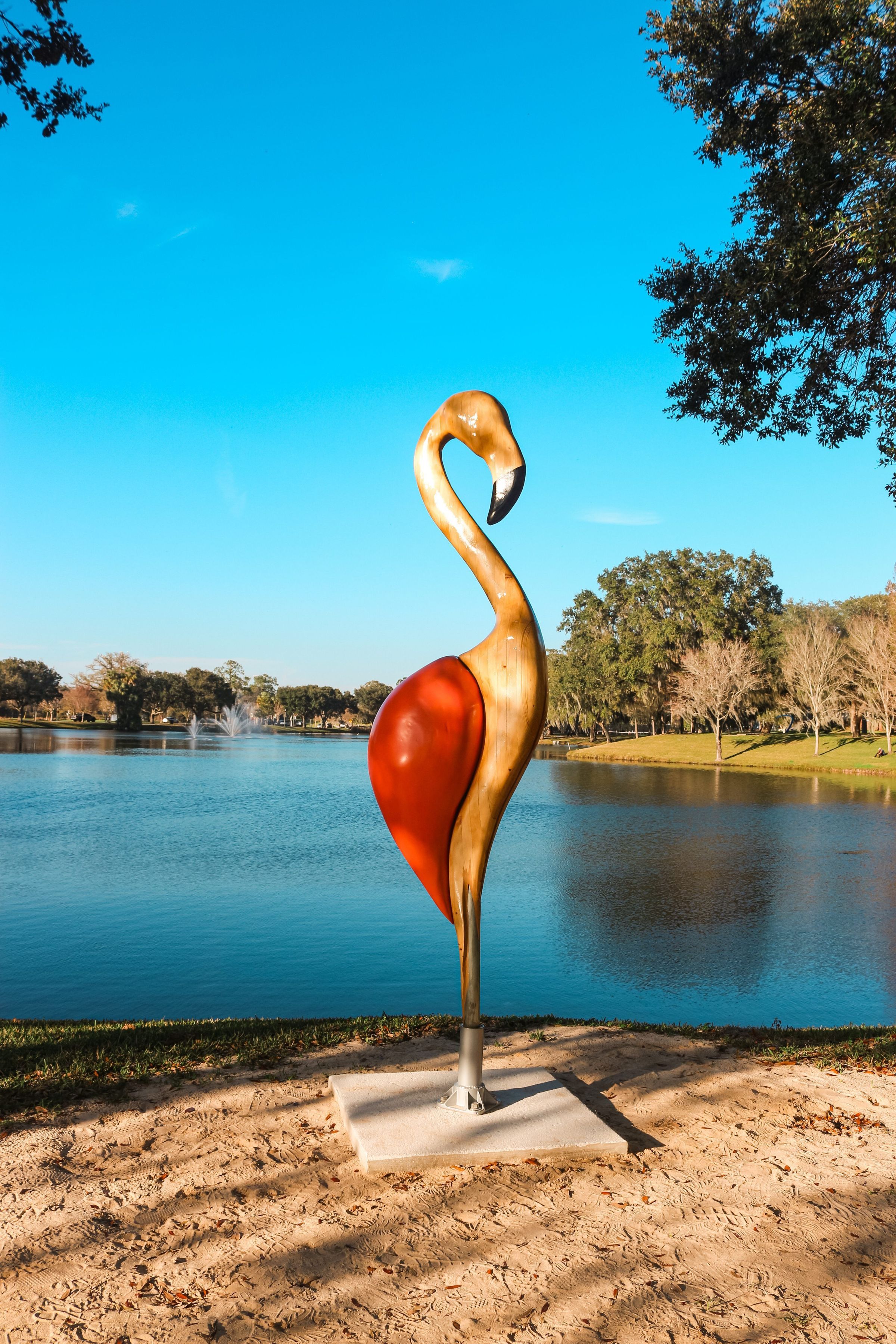 Large wooden sculpture of a stylized flamingo