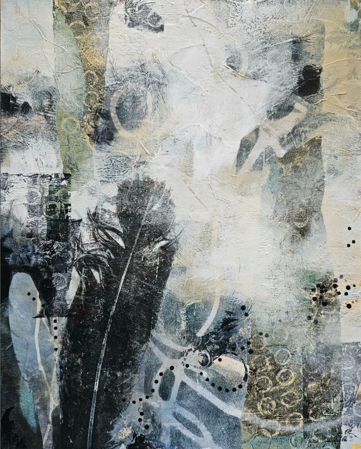 A black feather on the lower left corner over a textured and patterned background in yellow, black, white, and hints of teal greenMade/Created