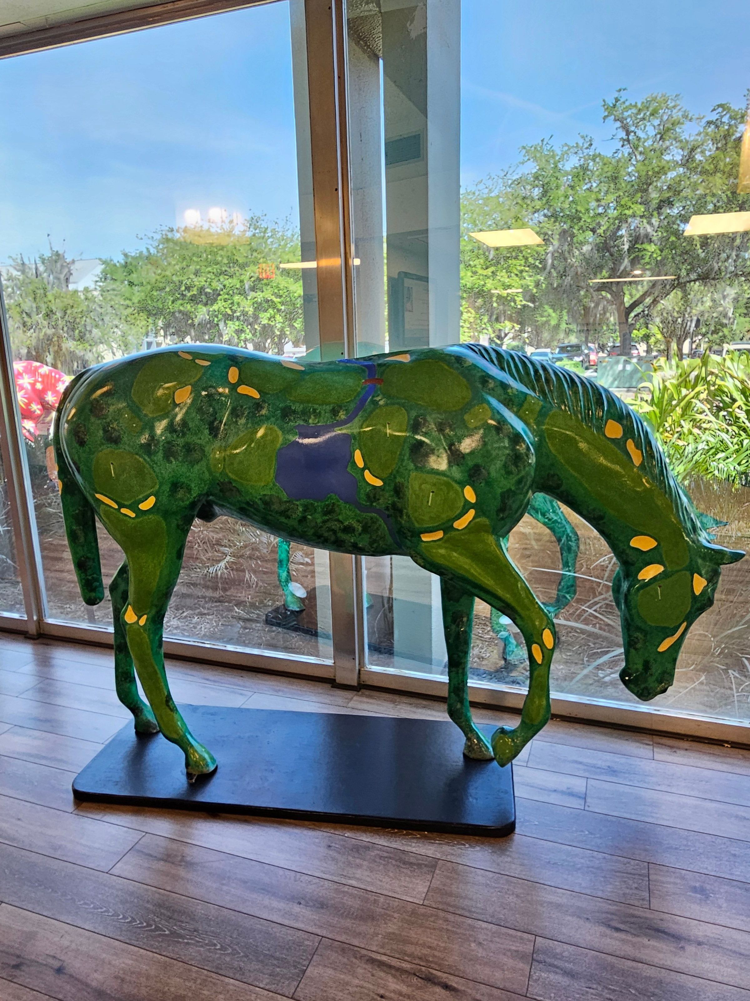 Fiberglass Horse Fever statue with painted arial images of a golf course.