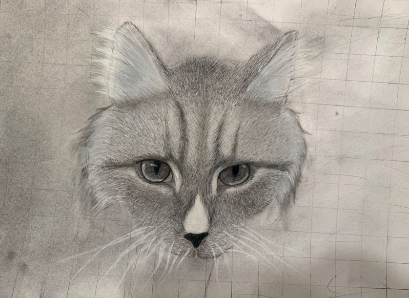 Greyscale rendering of a cat's face with a black nose