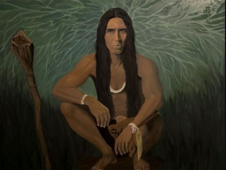 Indigenous man on a green background faces the viewer and sitting on his heels with a staff upright to his right side.