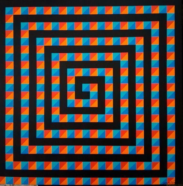 Two geometric spirals interlock towards the center; one spiral is solid black, and the other is made up of parti-colored squares in an alternating pattern. One square is two shades of orange, while the other is teal and blue. Depending on where the viewer stands, an hourglass illusion appears.Made/Created