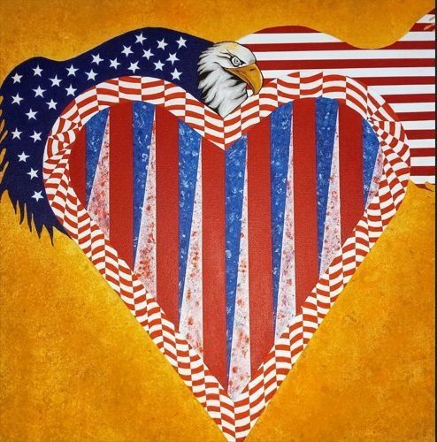 On a golden background, and eagle with American flag patterned wings rests on top of a heart. Inside the heart shape is a striking vertical pattern of blue and white triangles next to bands of red, all bordered by a check-type red and white pattern.Made/Created