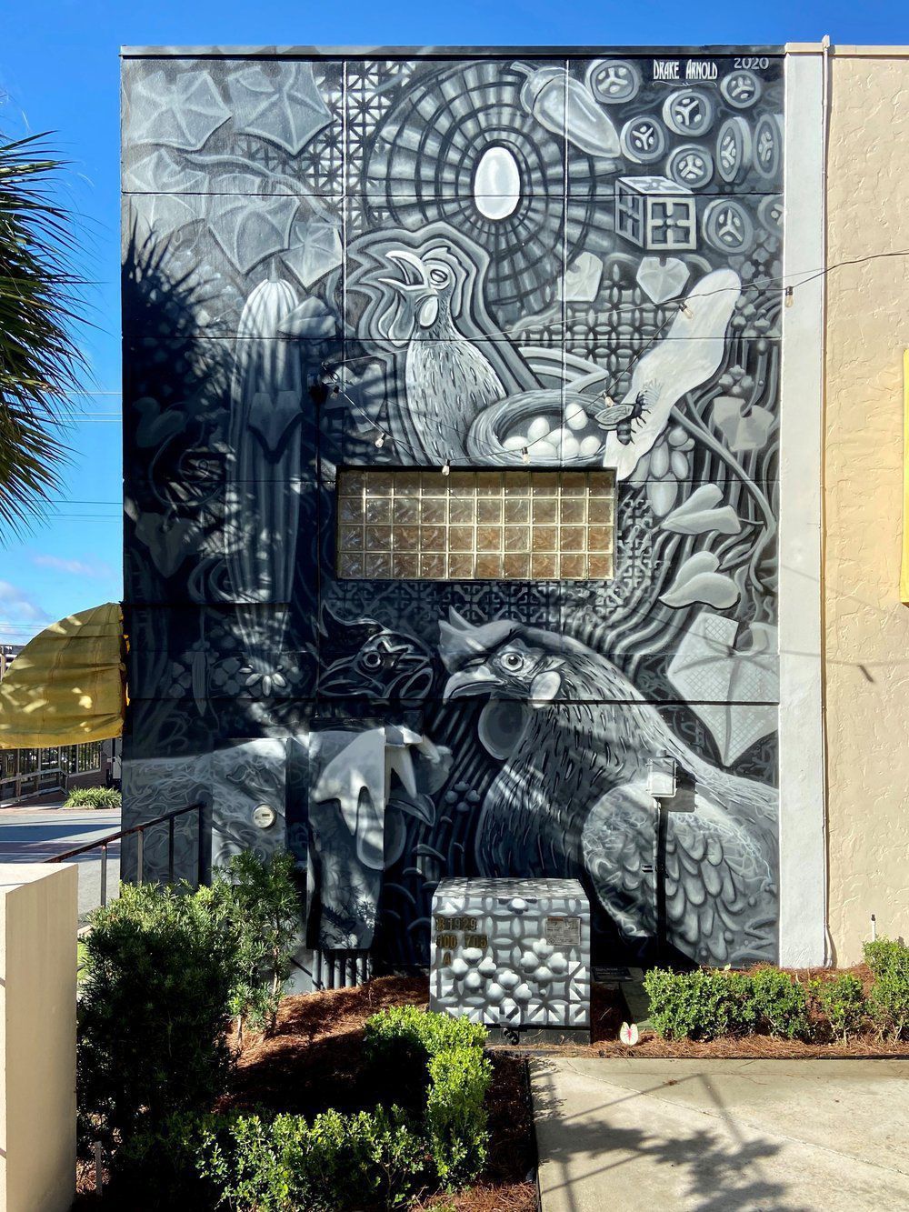 The concept for this mural was inspired by Arnold’s homestead that he began creating with his family in 2019. After developing an intense passion for gardening, a variety of animals including chickens, ducks, turkeys, a rabbit and a pig were added to the thriving farm, creating his own paradise.