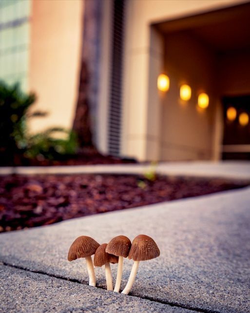 Four brown mushroom caps in focus grow up through a pavement seam in the foreground with a lighted entry in soft focus in the background.Photograph Details