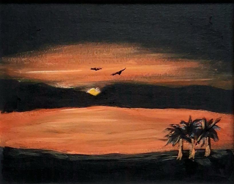 An orange and black sky reflecting on a body of water. Three palms in the lower right corner as two birds glide towards the setting sun.Made/Created