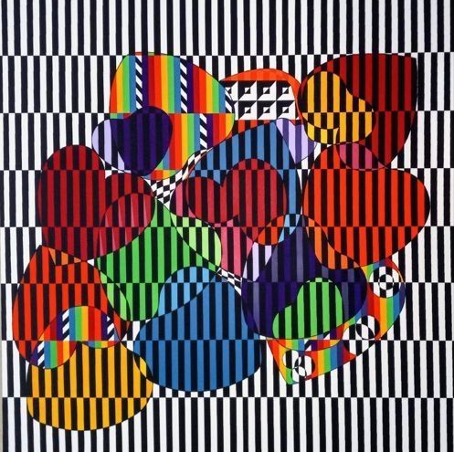 A series of overlapping hearts in multi-colored stripes and patterns sits on a background of alternating black and white columns and rows.Made/Created