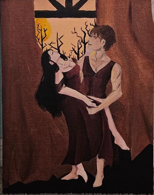 Two figures wearing deep red in a close embrace in front of a red curtained window showing a sun setting over bare trees.Exhibitions