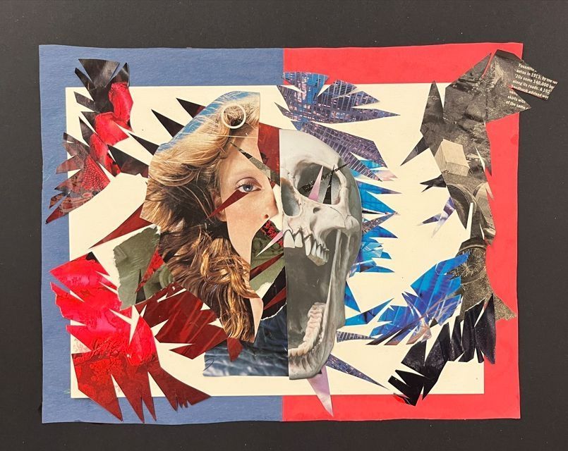 Blue, red, black and white cut paper of half a woman's face and half an open jawed skull with angular cut out shapes around the borderExhibitions