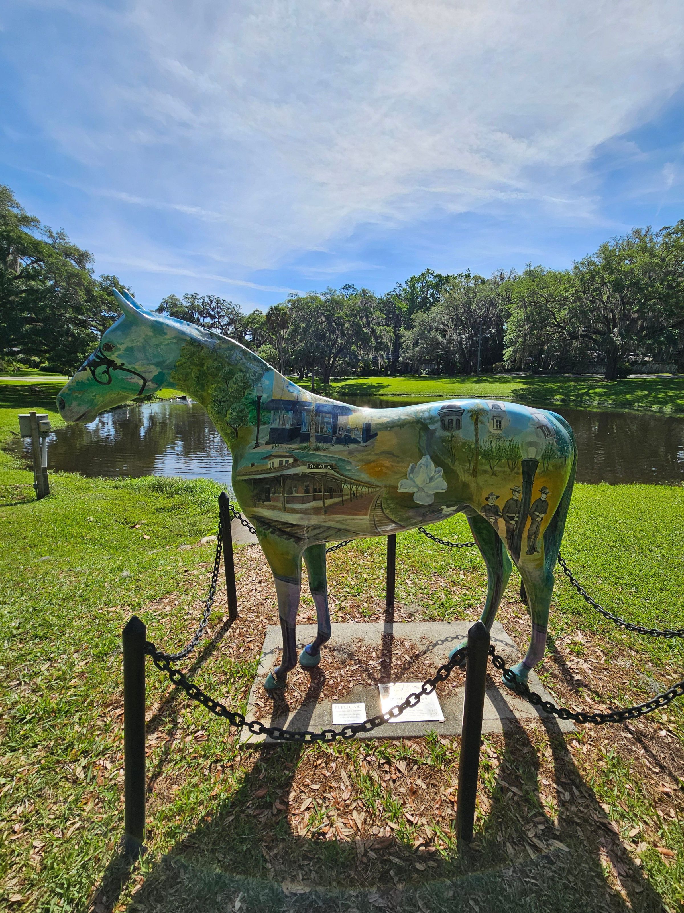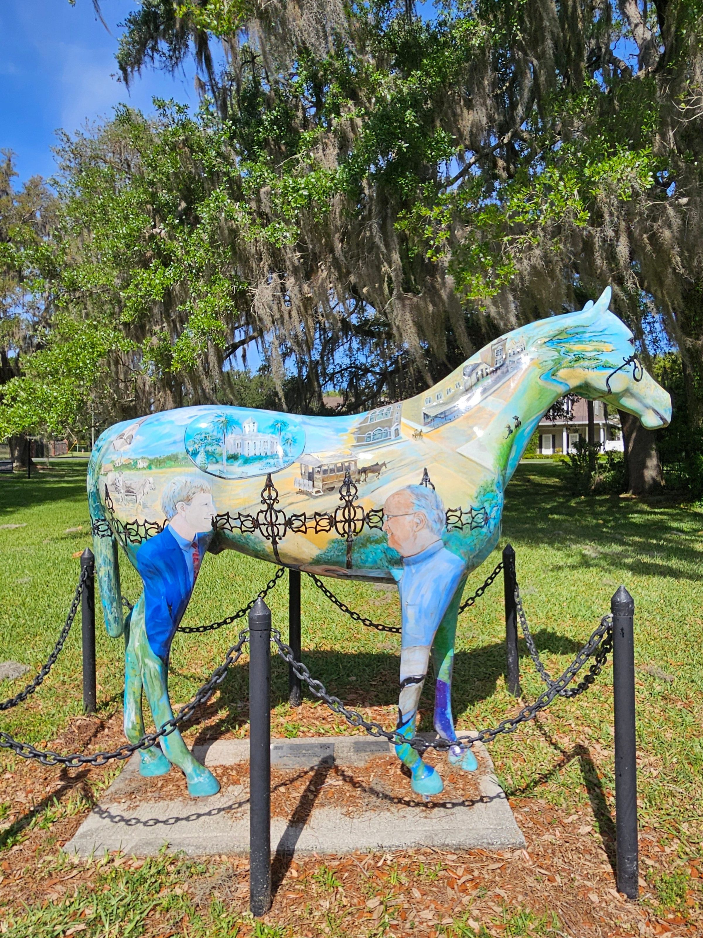Fiberglass Horse Fever statue painted with scenes of Ocala's history, people and buildings.