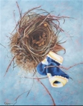 An empty nest nestled above dark-blue and cream baby booties on a mottled light-blue background.Made/Created