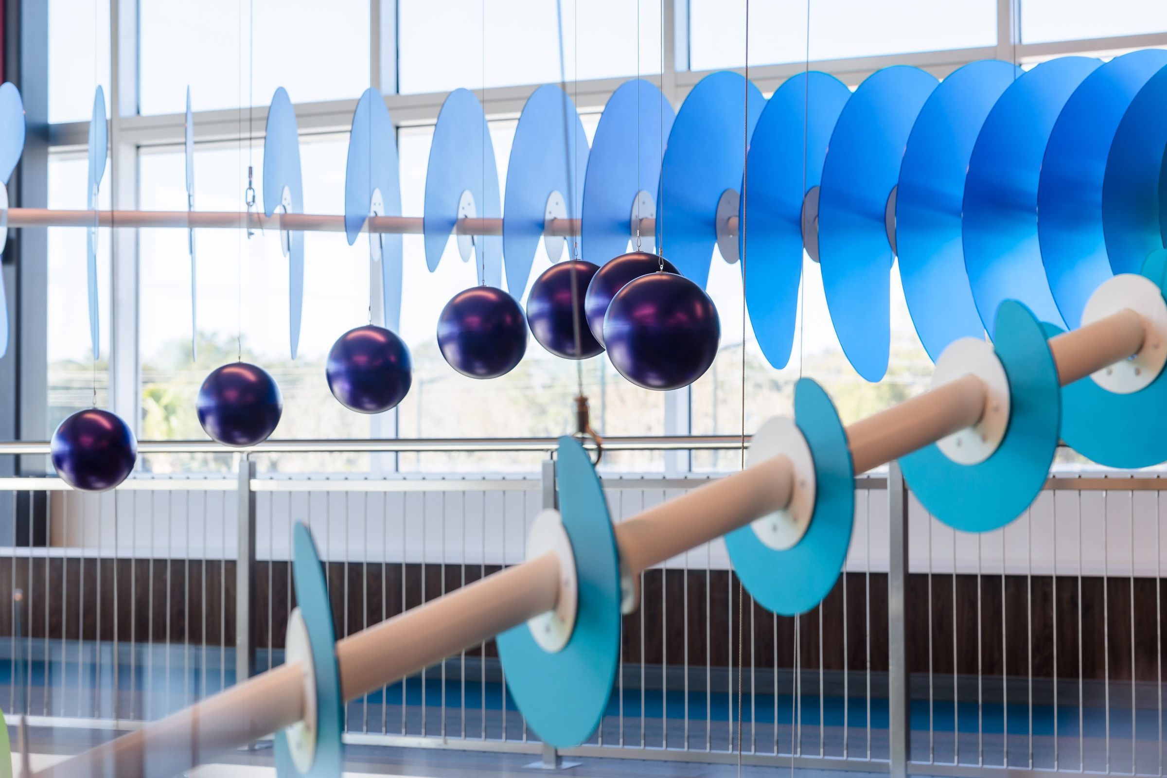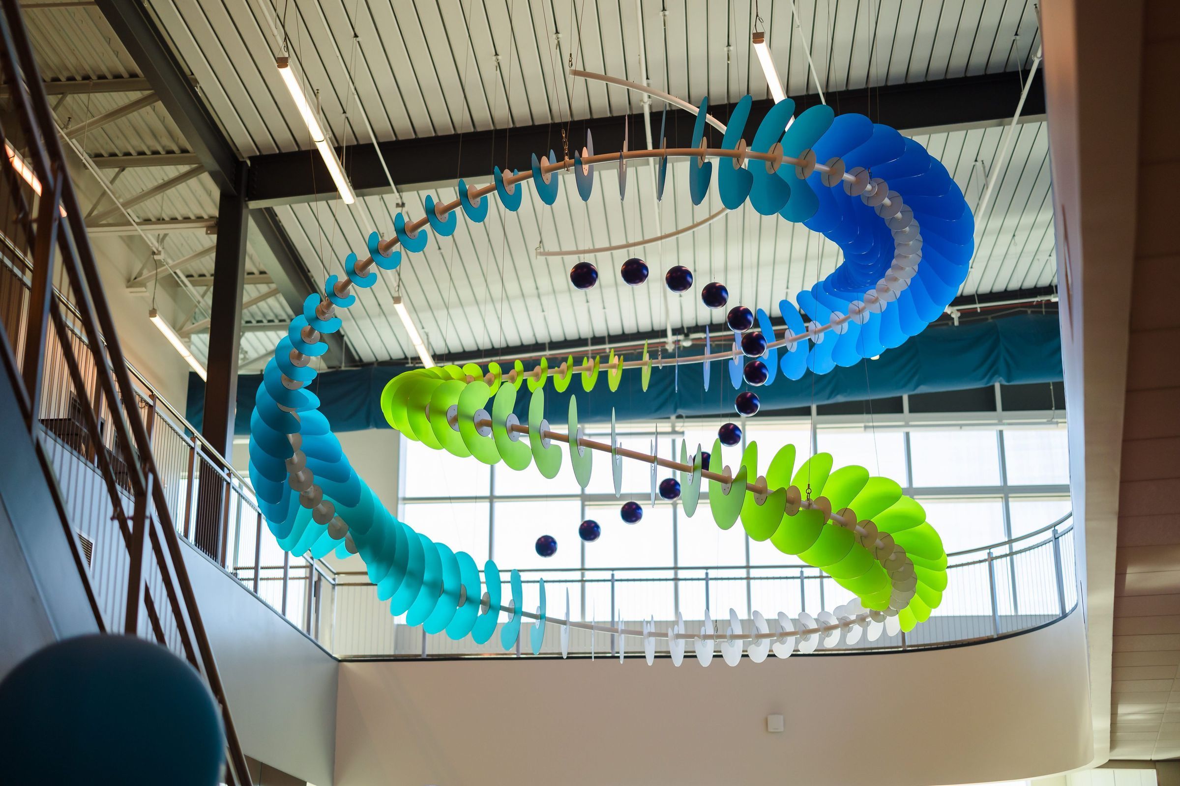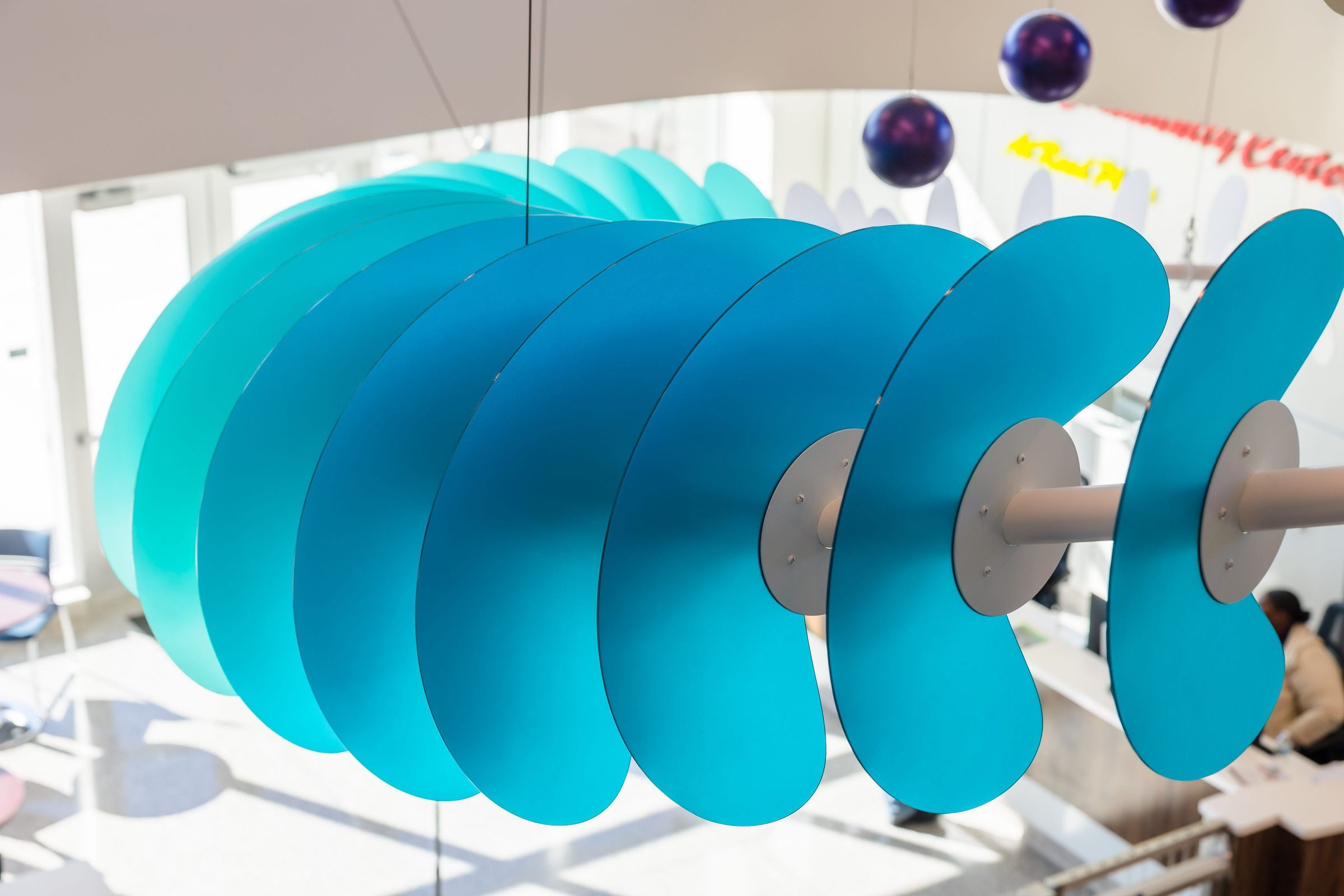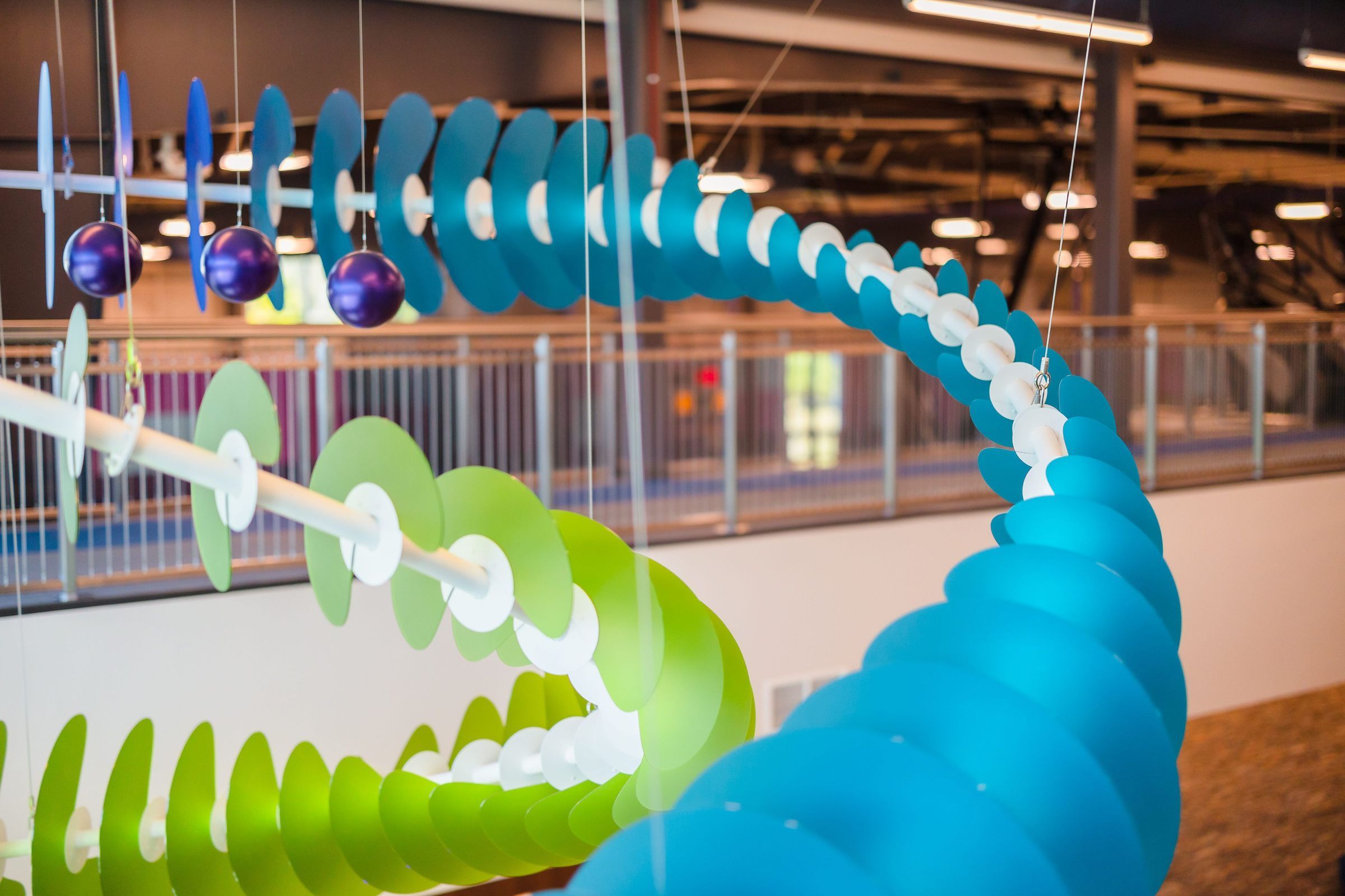 Suspended sculpture with blue, green, and white translucent discs arranged in circular patterns with sizes gradually growing and shrinking in a motif to motion itself.Artwork Details