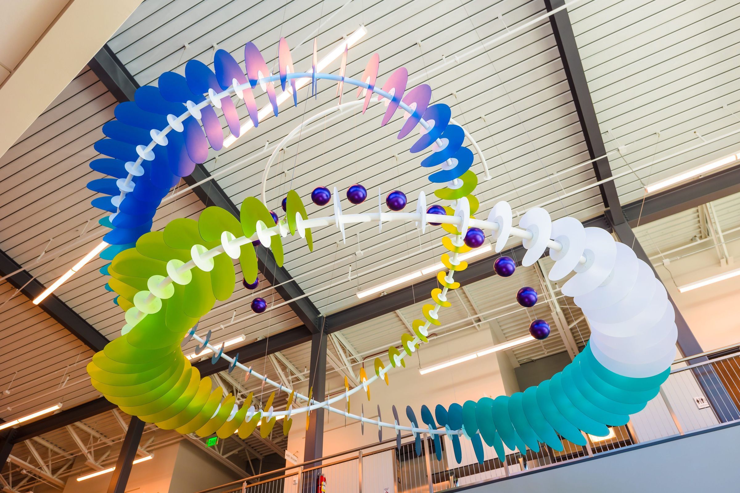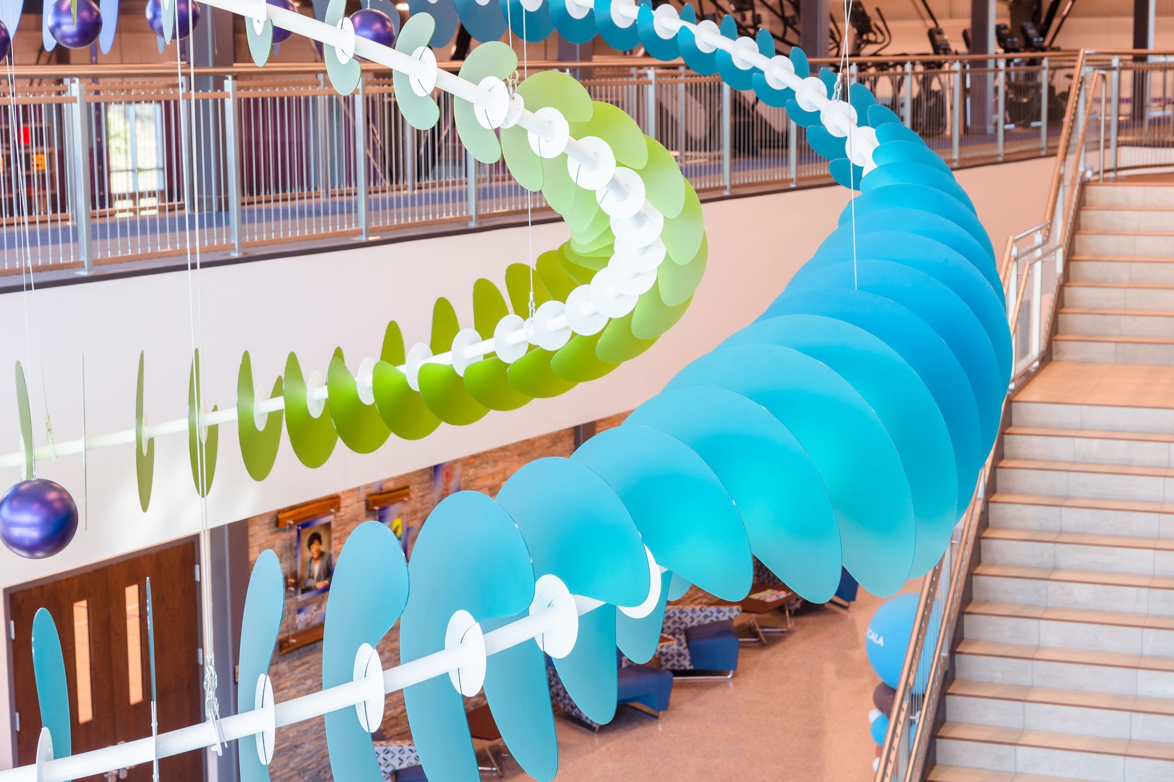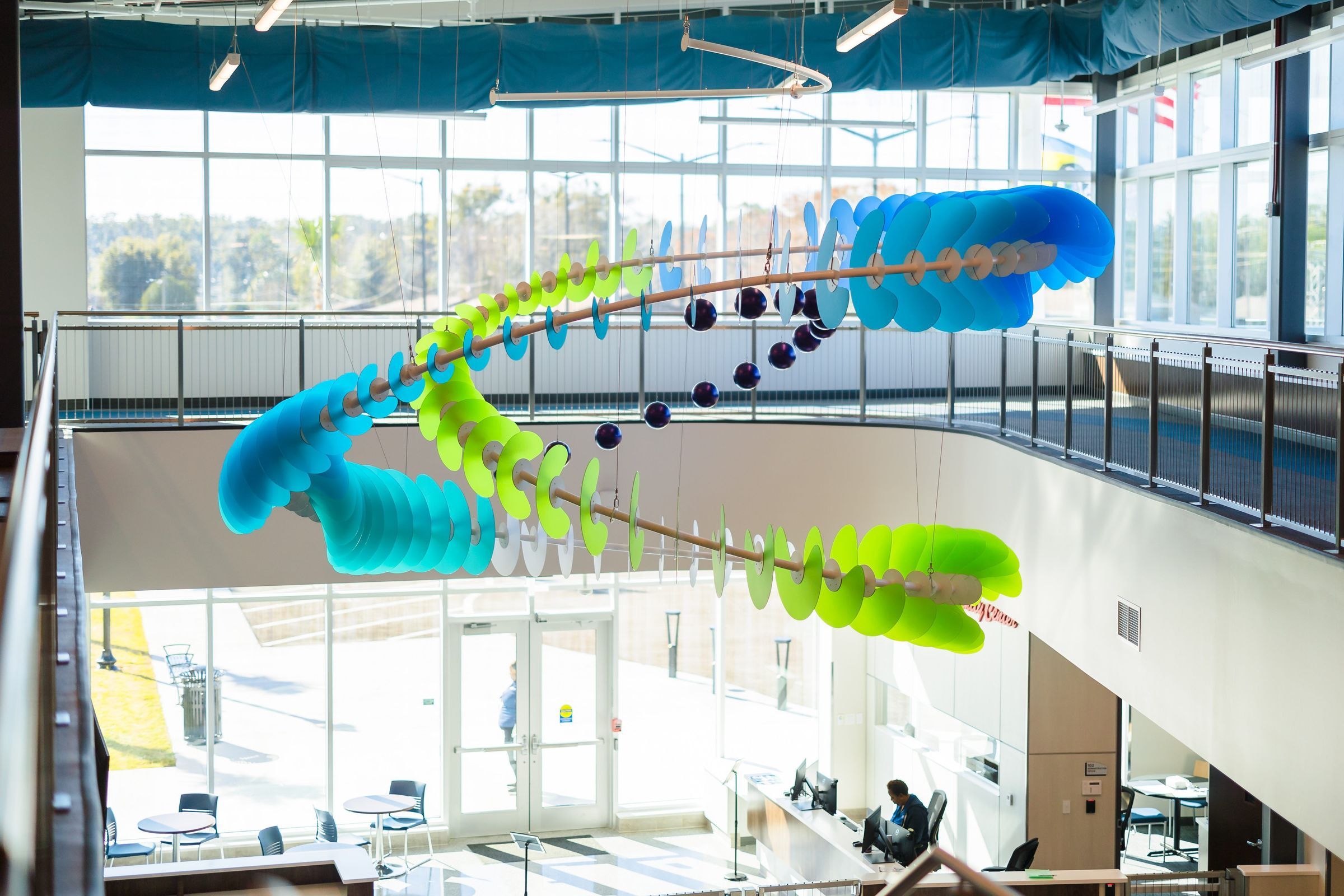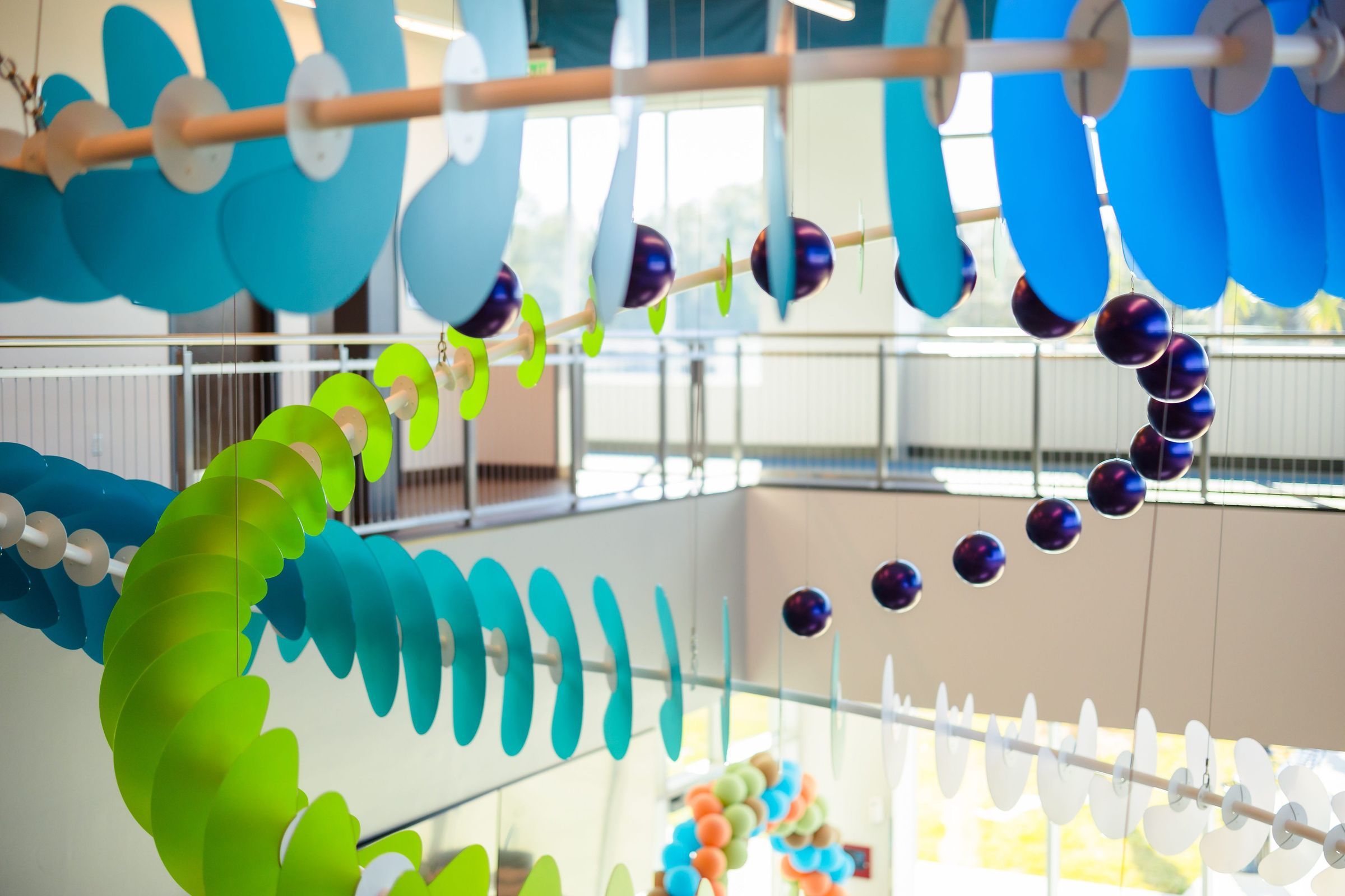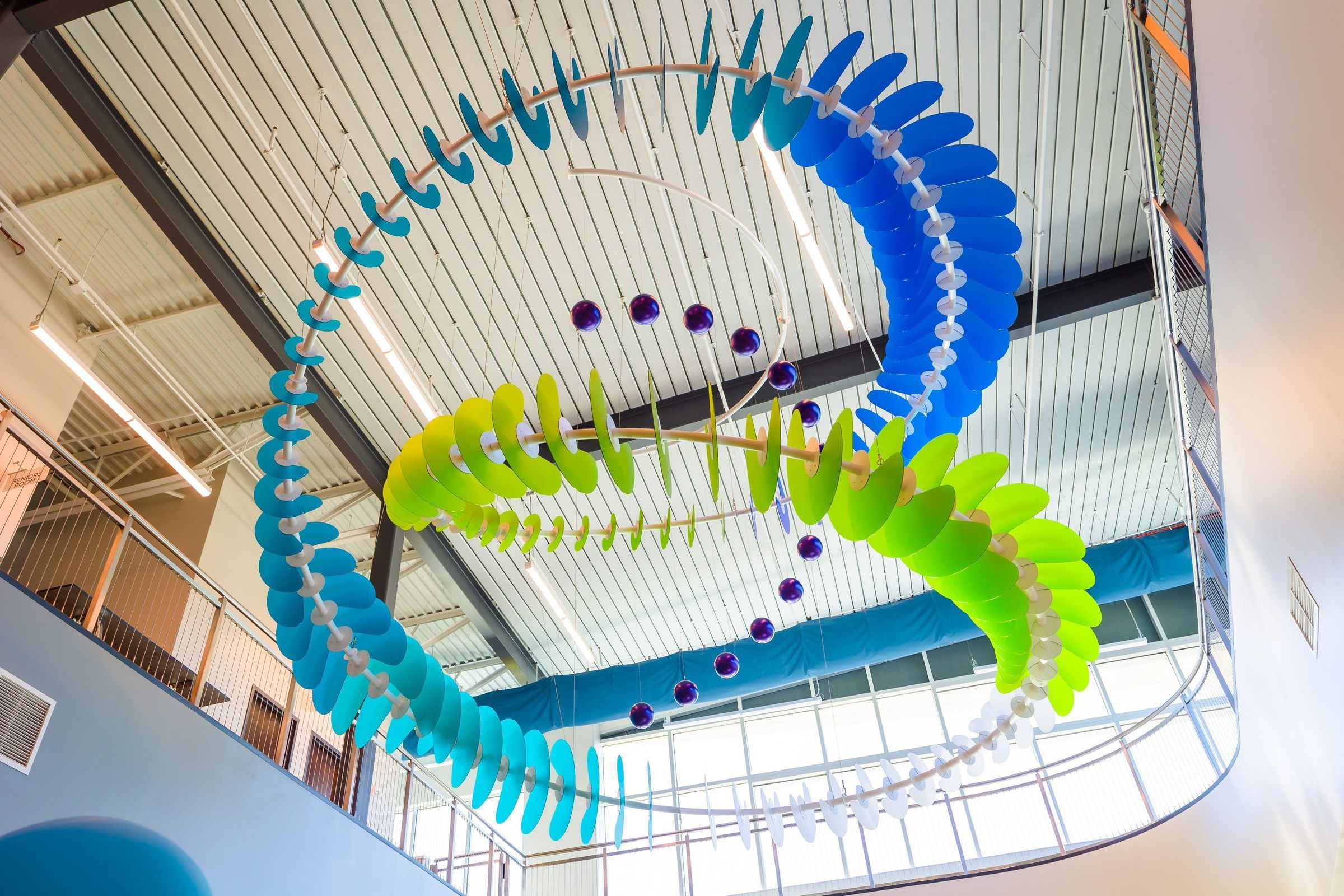 Suspended sculpture with blue, green, and white translucent discs arranged in circular patterns with sizes gradually growing and shrinking in a motif to motion itself.Artwork Details