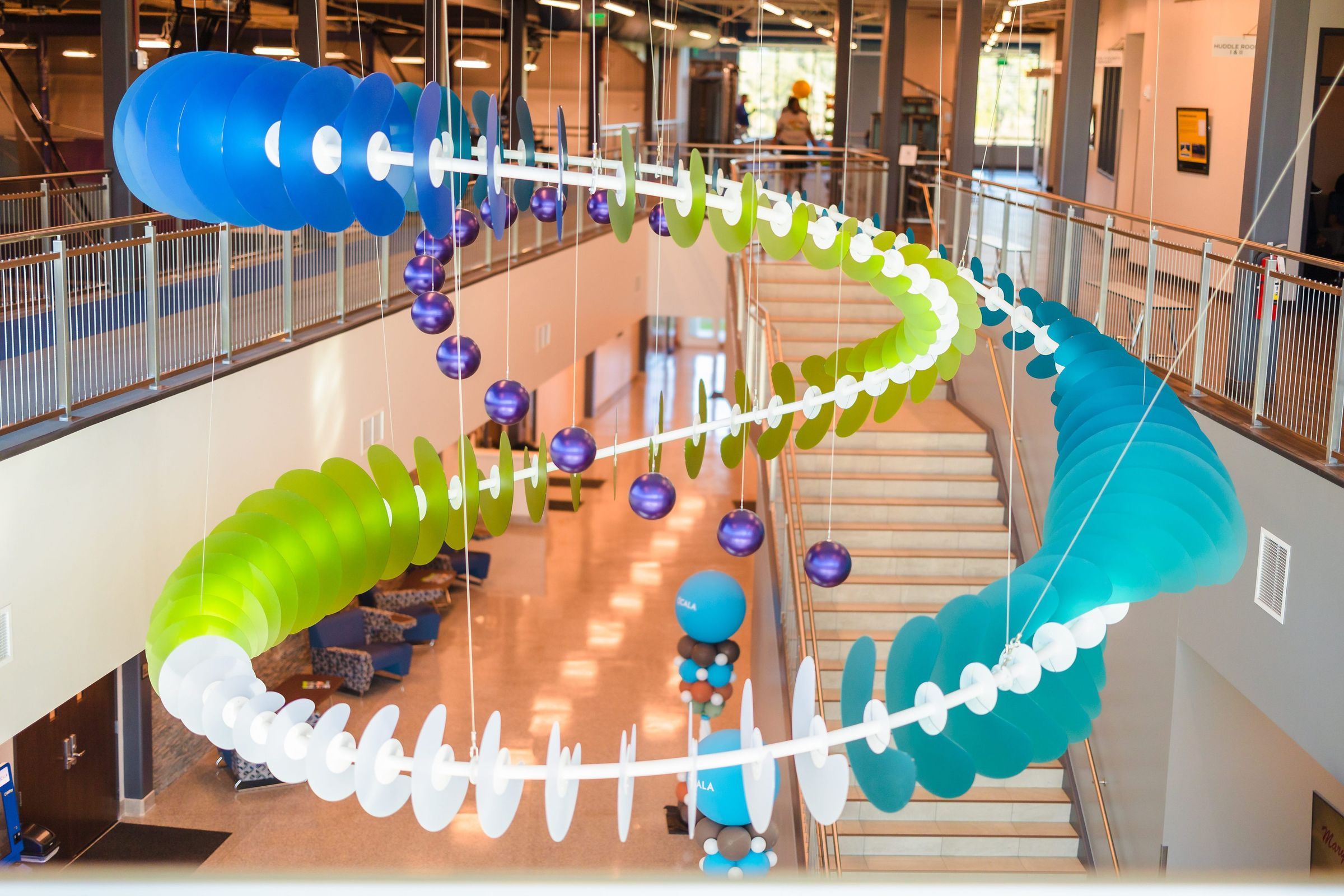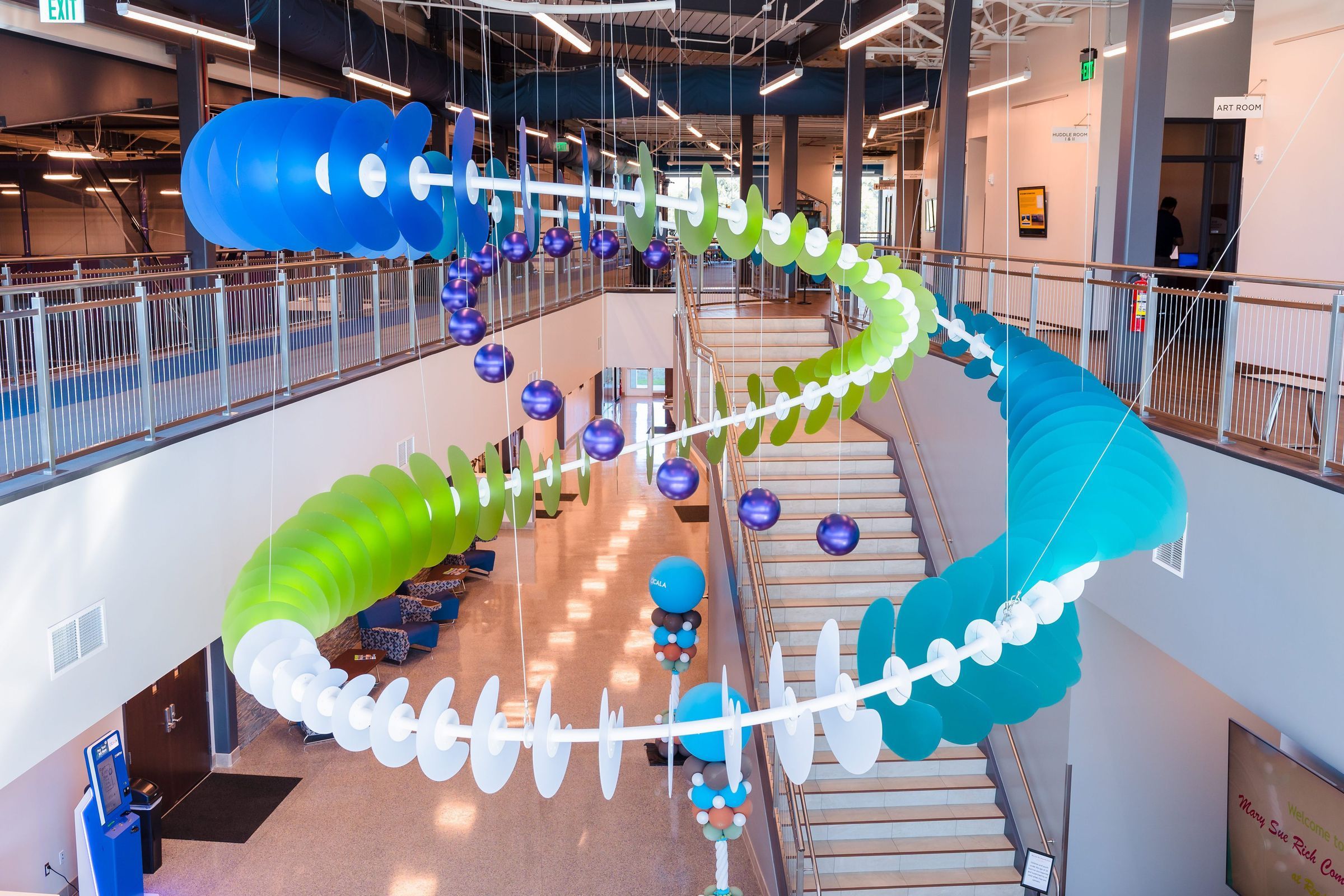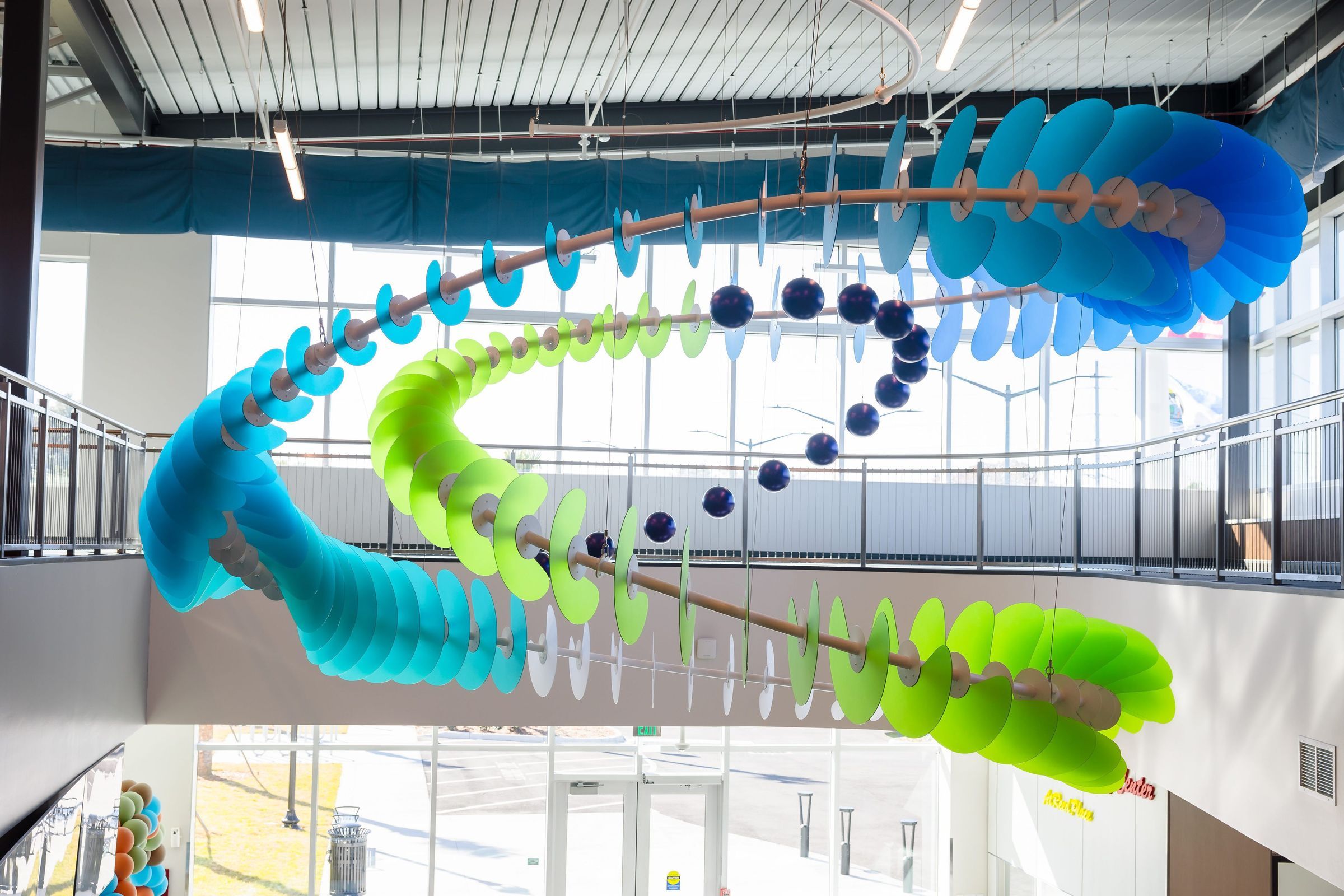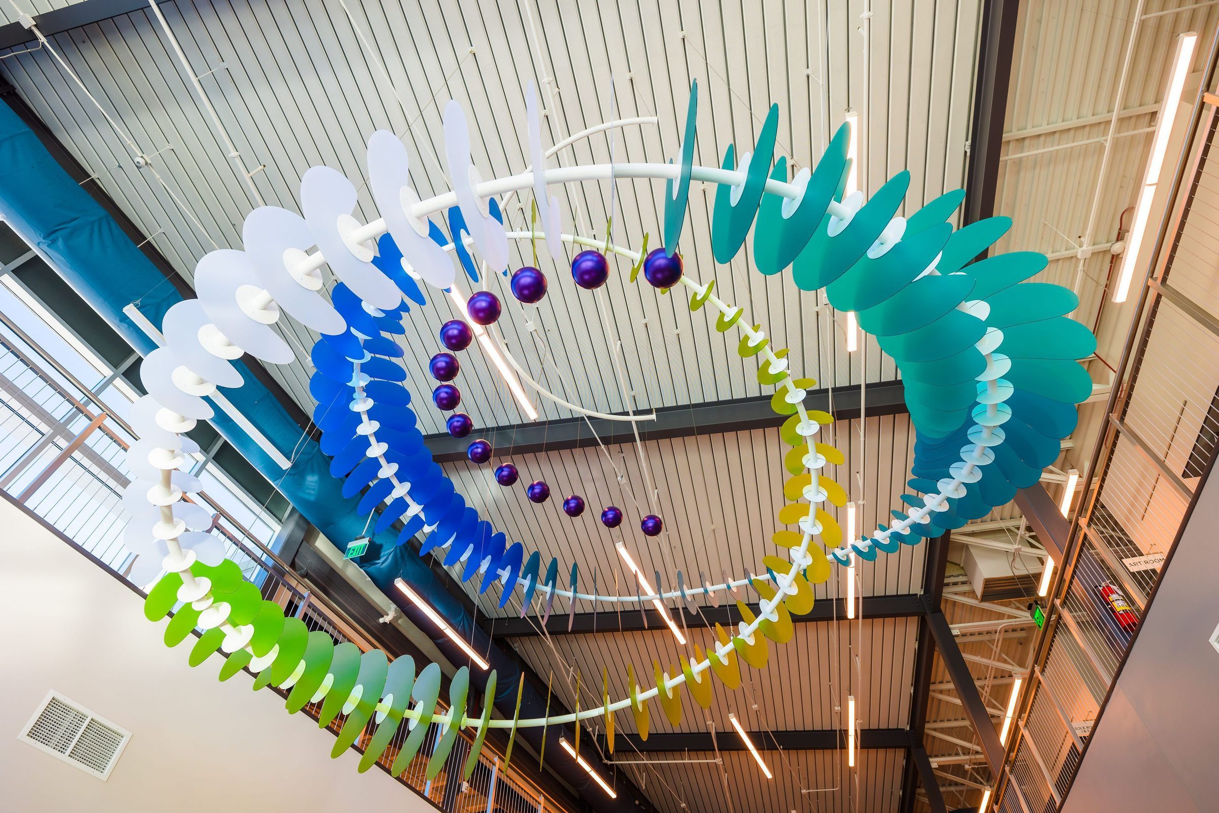 Suspended sculpture with blue, green, and white translucent discs arranged in circular patterns with sizes gradually growing and shrinking in a motif to motion itself.Artwork Details