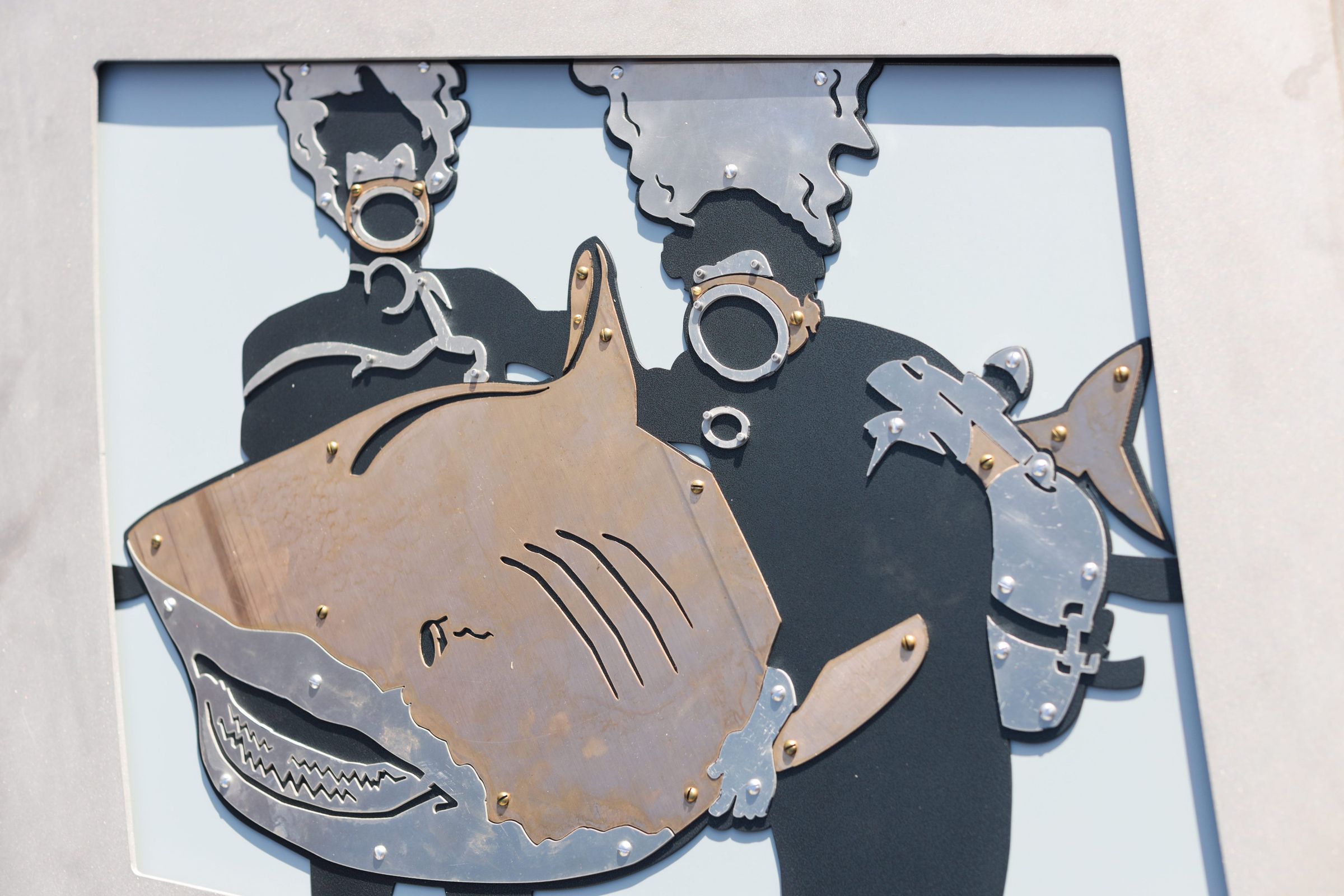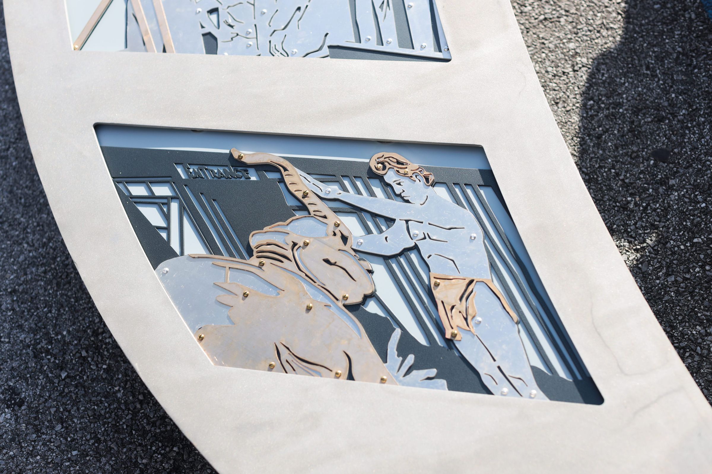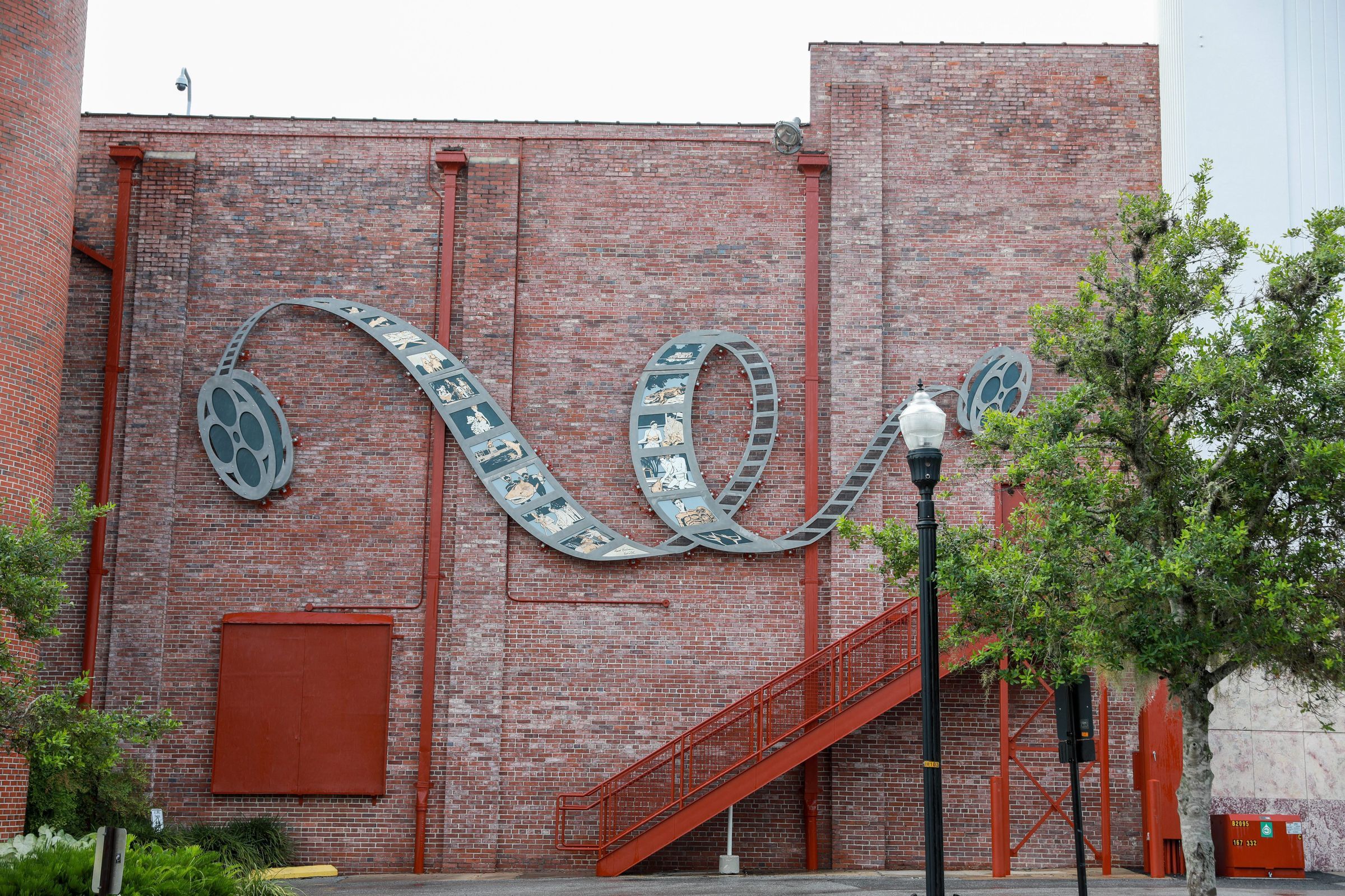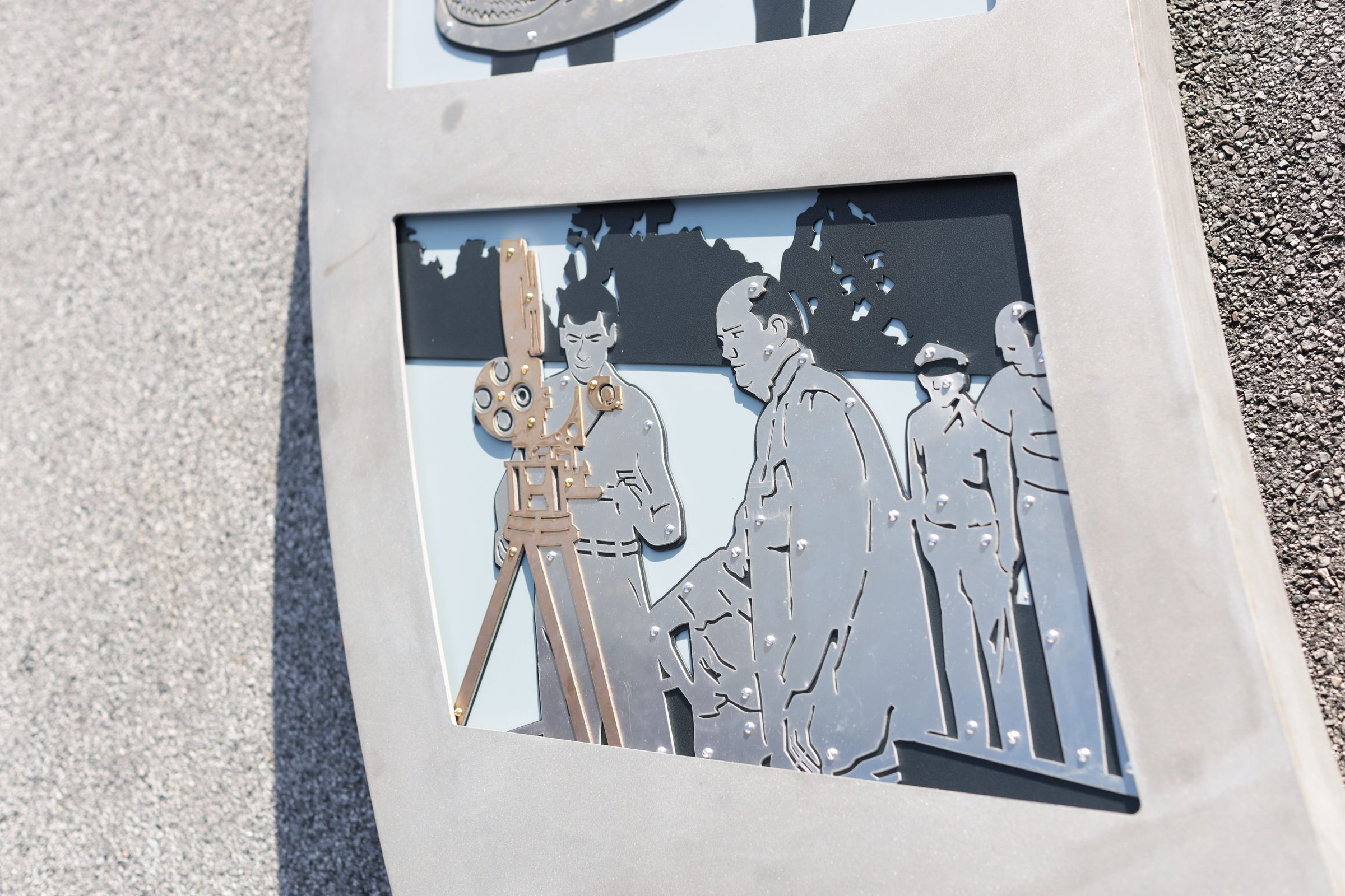 Sculpture in the likeness of a film strip with two reels and 10 individual frames visible.