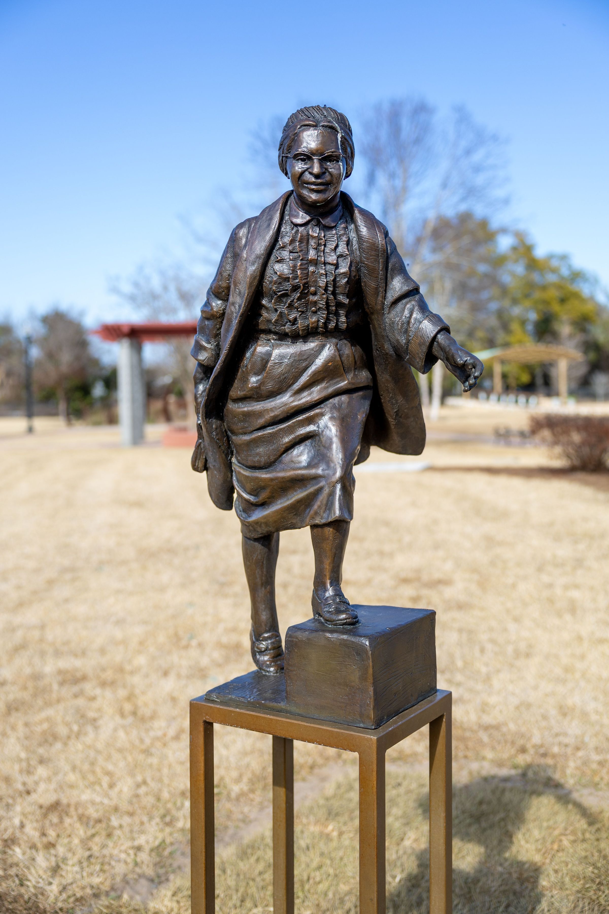Rosa Parks mid step on an open rectangular base