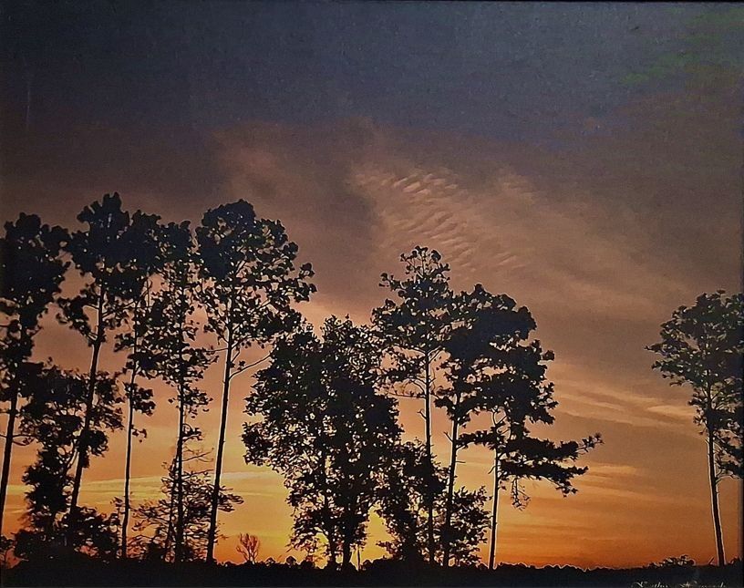 Lavender, gold, and orange-streaked clouds at sunset behind dark silhouetted trees.Photograph Details