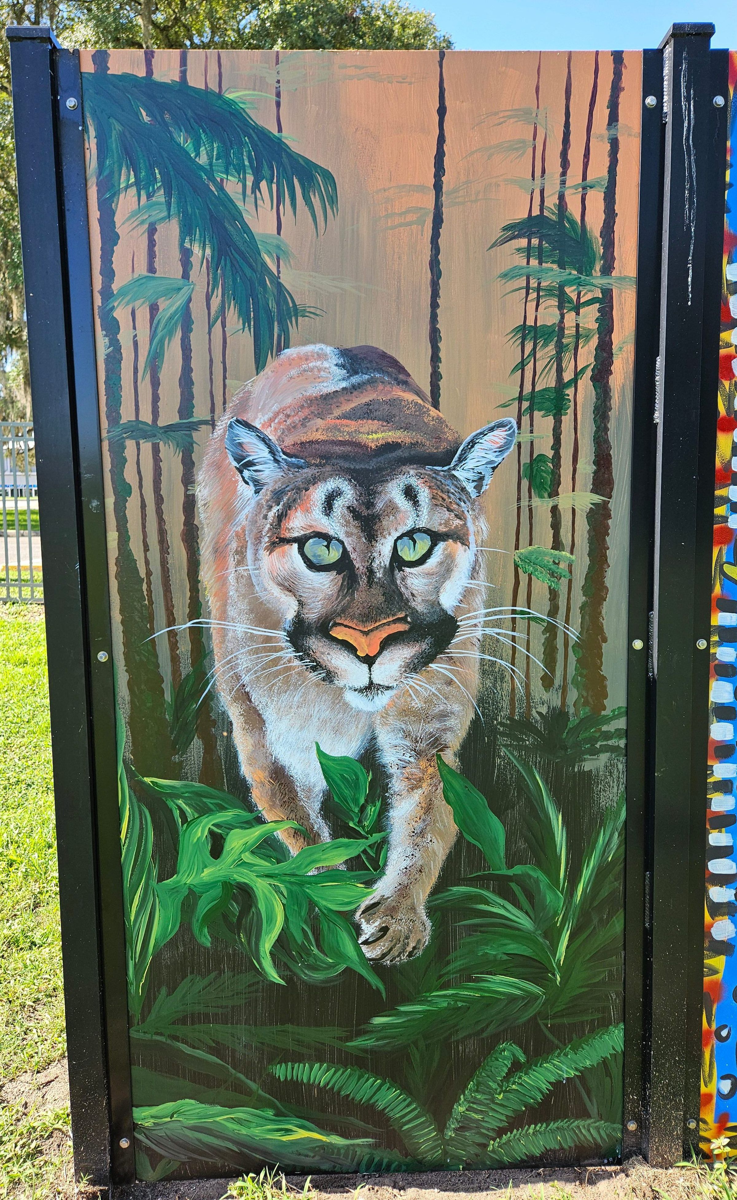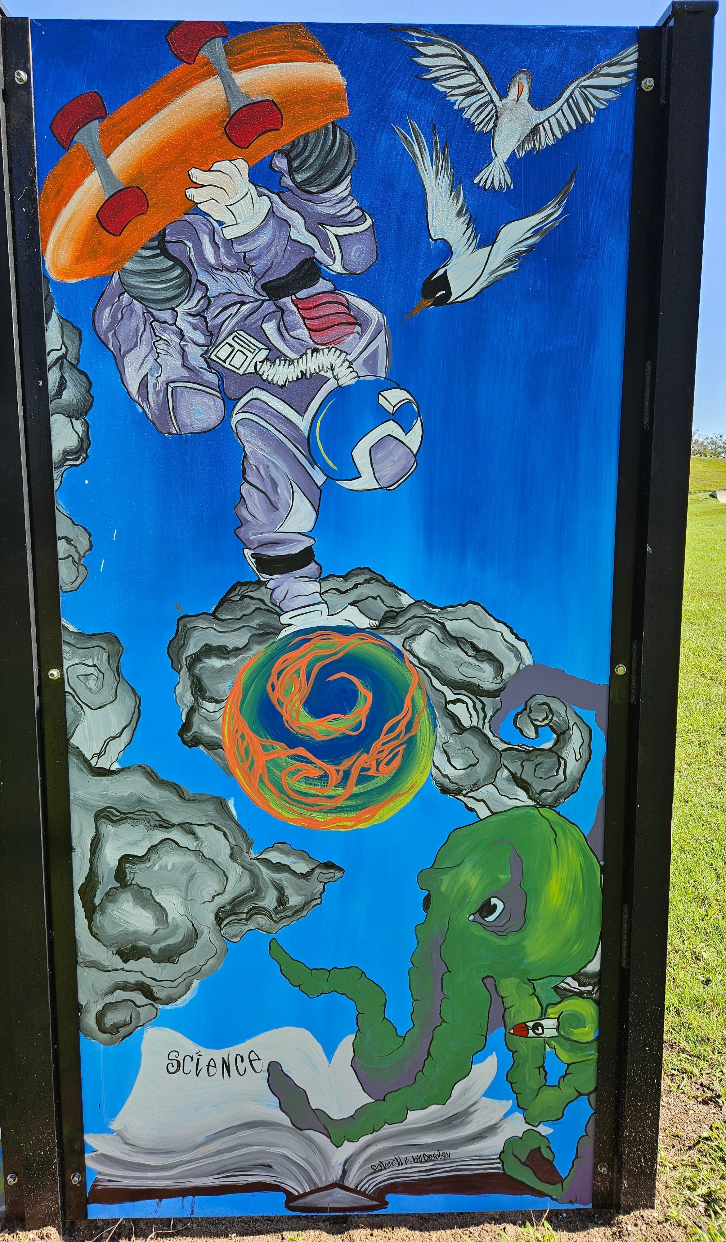 Double-sided aluminum panel with a painting of a prowling cougar and an astronaut skateboarder skating over an octopus and an open bookMade/Created