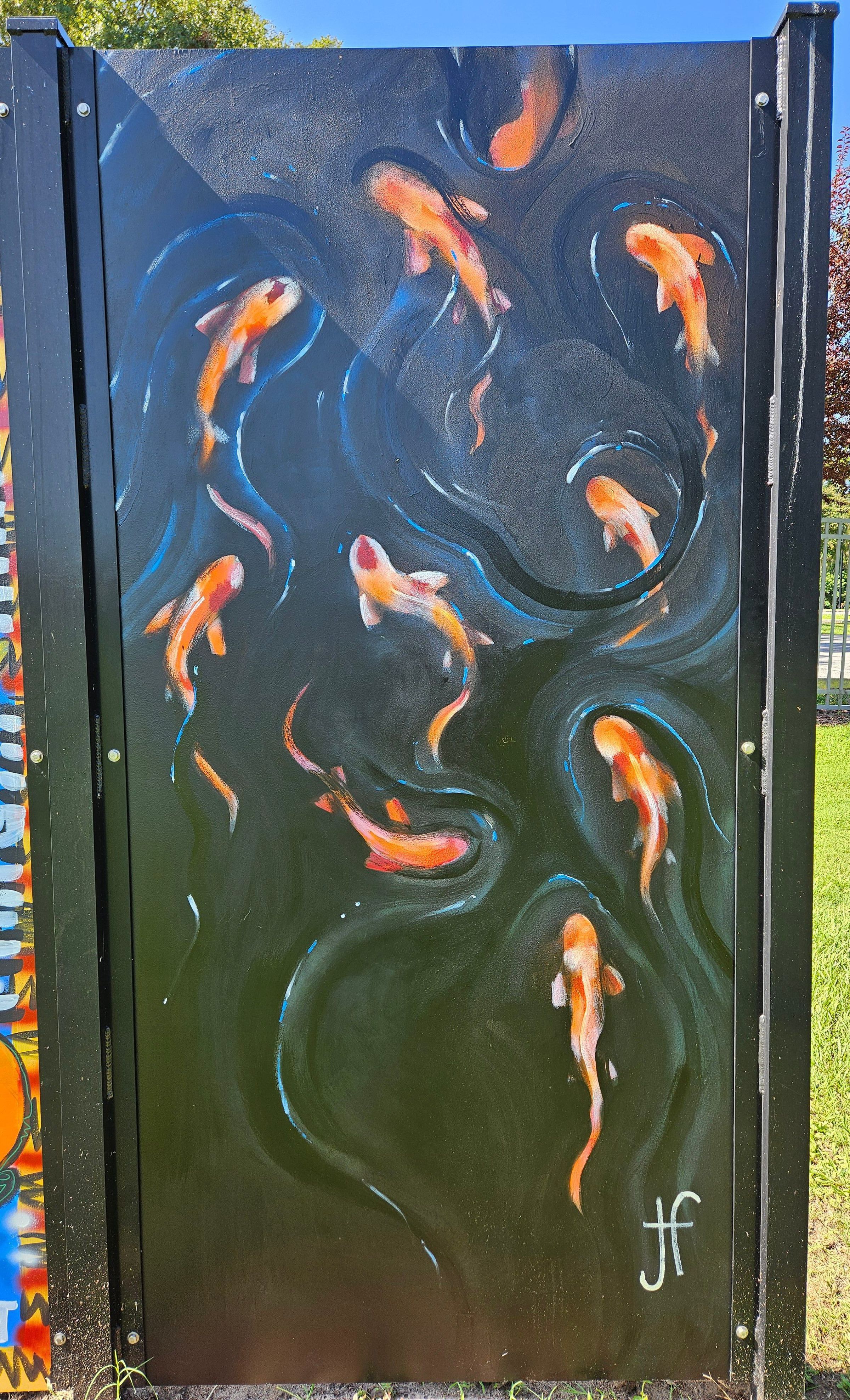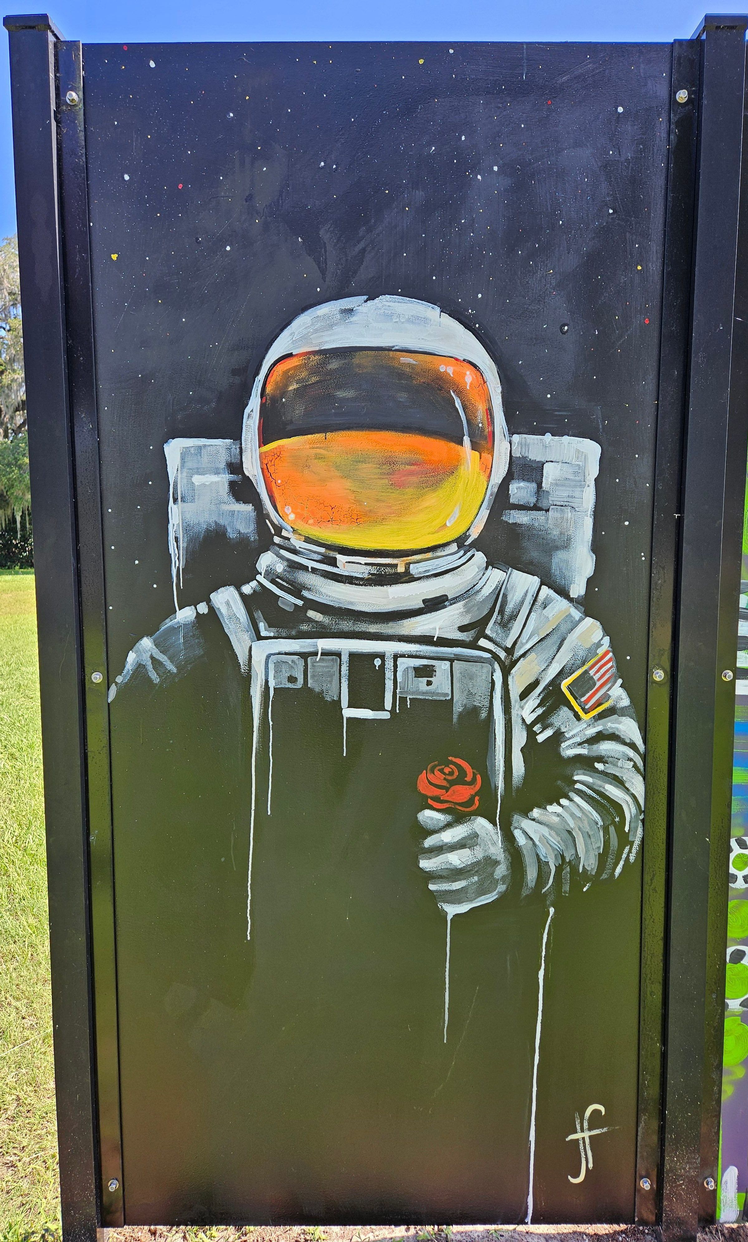 Double-sided aluminum panel with a painting of an astronaut holding a rose and a group of swimming koi fishMade/Created