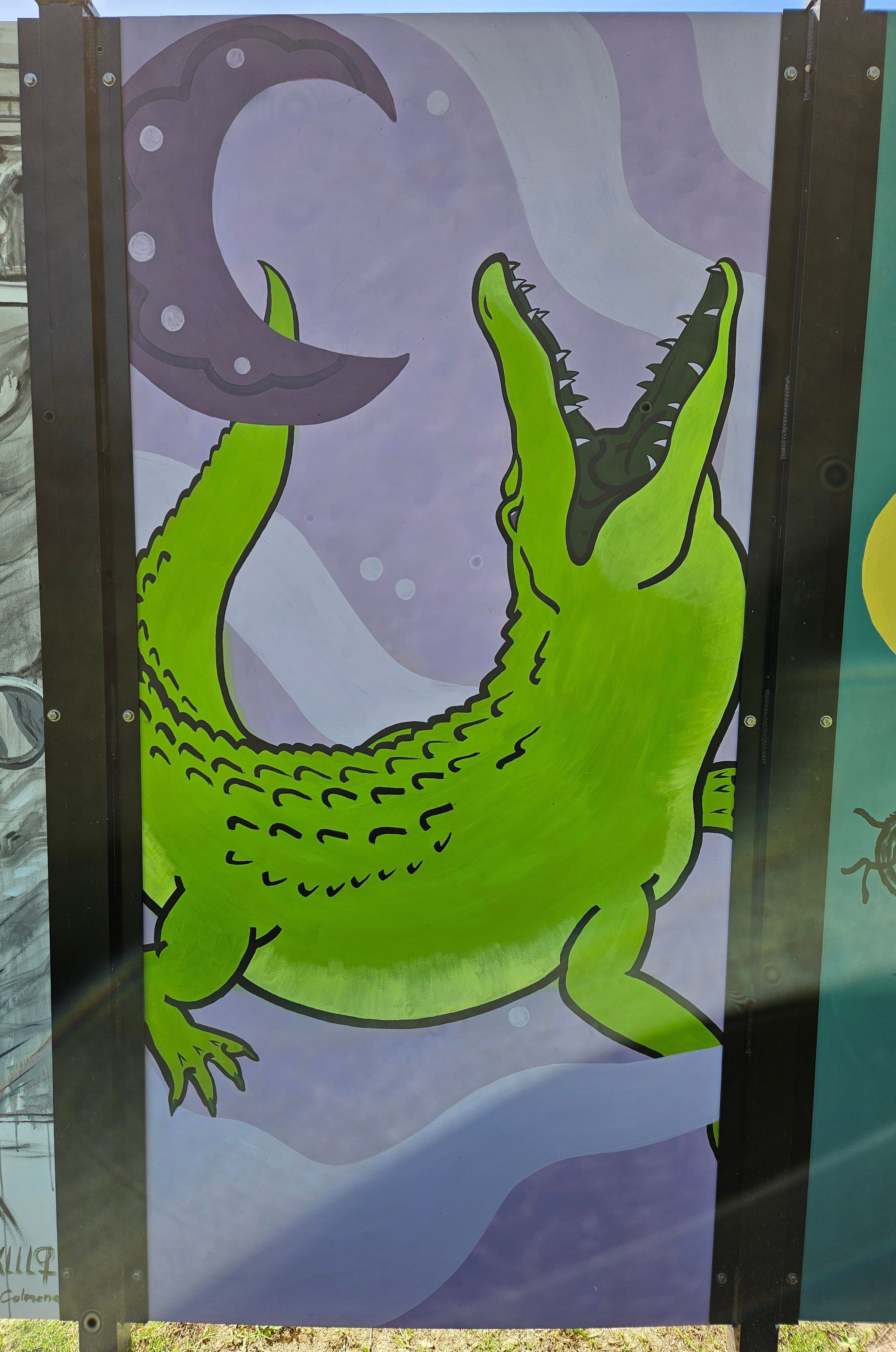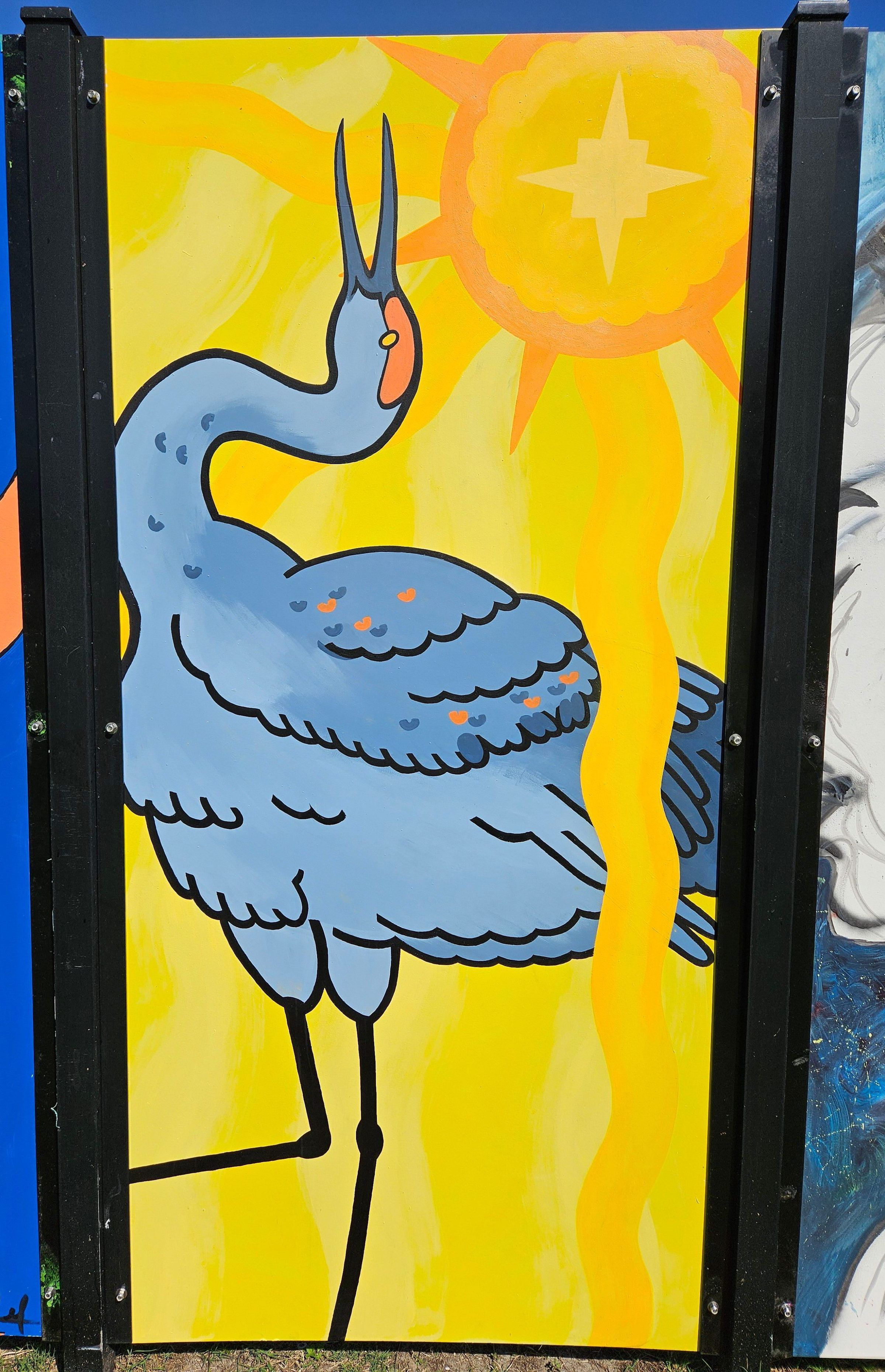 Double-sided aluminum panel with a painting of a sandhill crane on yellow background with a sun and an alligator on a purple background with a moonMade/Created
