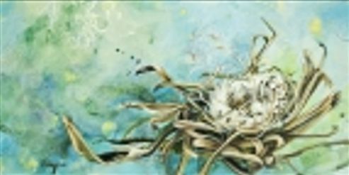 A cream-colored downy nest surrounded by long strips of skinny leaves sits in the lower right of a mottled green and blue canvas.Made/Created