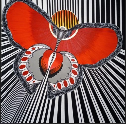 On a black and white striped background, a red butterfly rises to the right over a red, yellow, and black circle. The butterfly's wings are a red gradient with black, white, and greyscale patterning.Made/Created