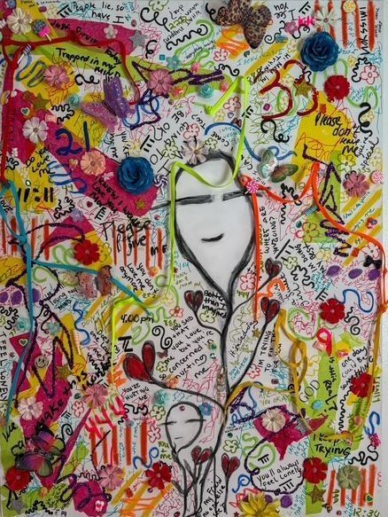 A neon multi-colored collage of butterflies, flowers, strings, and candy on a white background interwoven with hand-written words shapes and short phrases all surround a central simplistic face.Exhibitions