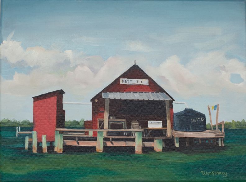 A red bait house with a tin roof sits on a pier over calm green water with a cloudy blue sky behind.Exhibitions