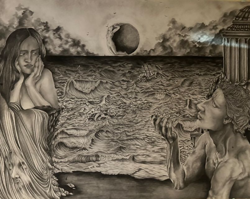 A female and male figure in the foreground look toward one another questioningly while a ship and sirens navigate a stormy sea. On the bottom left is a veiled face, on the upper right is a Greek structure, and in the center above the waves in a cloudy sky is a woman curved over an orb.Dimensions