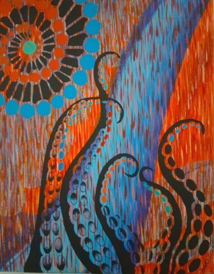 orange and blue brush stroke background with black octopus tentacles and a spiral pattern