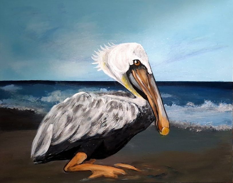 A pelican in profile on a sandy beach with blue and white waves crashing behindMade/Created