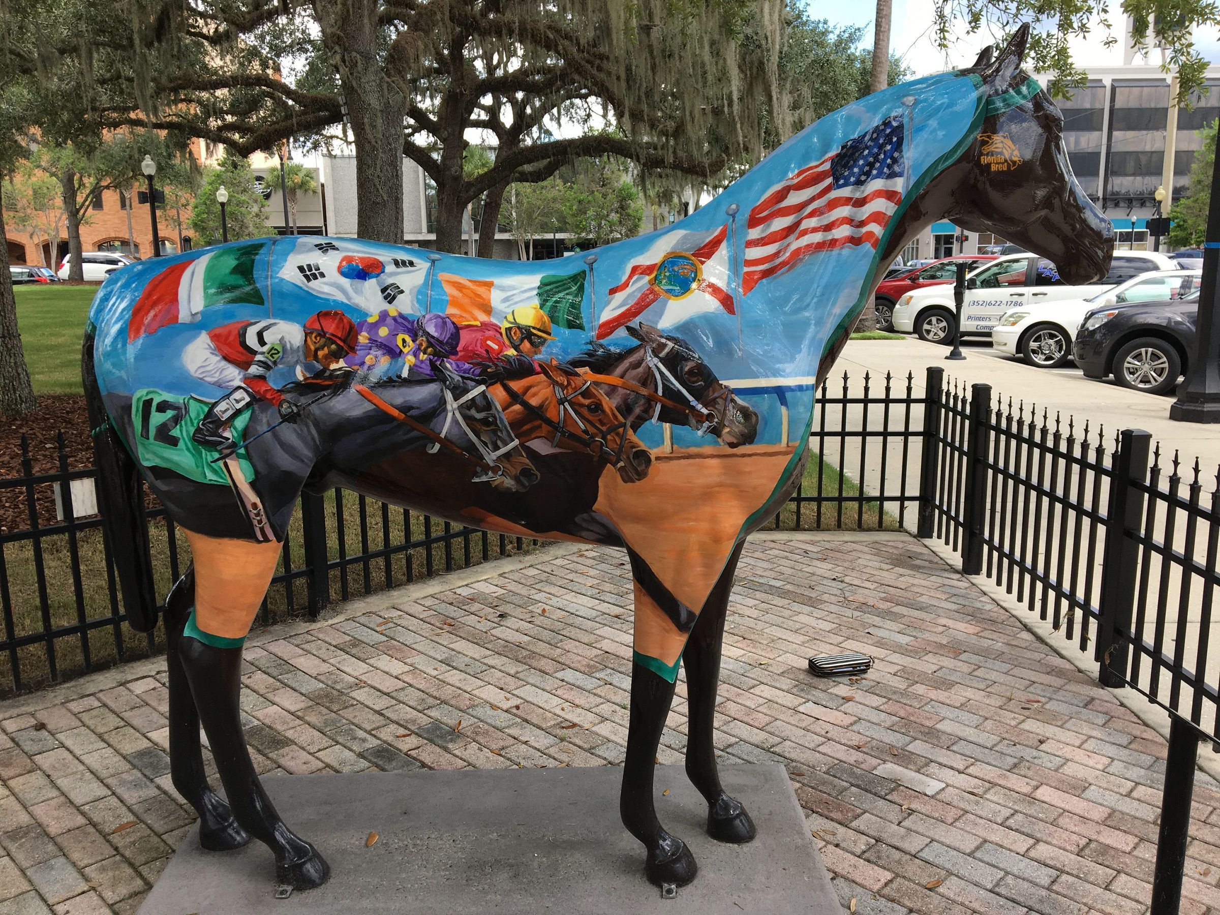 Fiberglass Horse Fever statue painted with horse pasture scene on one side, county and state flag and jockey racing jackets on the other side.Artwork Details