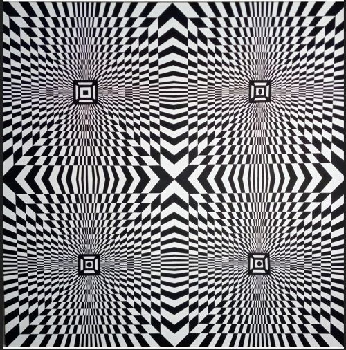 Black and white geometric checkerboard creating a four-square grid creating an optical illusion