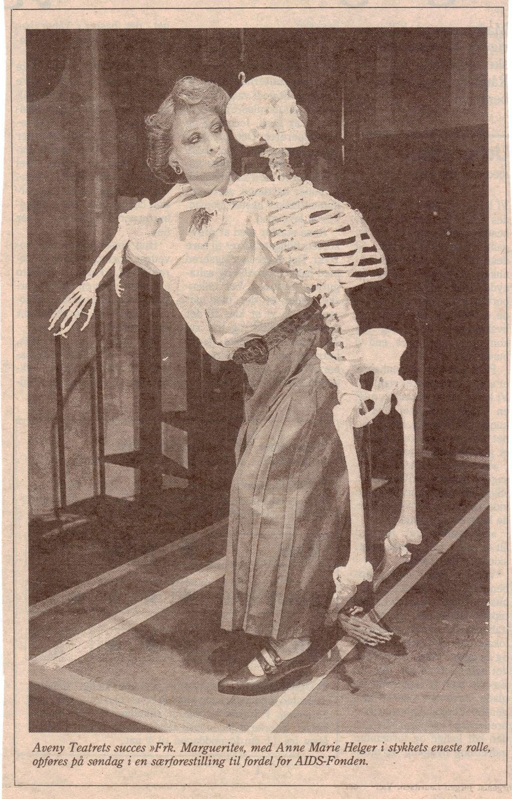 Aveny Teatrets succes "Frk. Marguerit", med Anne Marie Helger i stykkets eneste rolle, opføres på søndag i en særforestilling til fordel for Aids-Fonden.Entry/Object ID