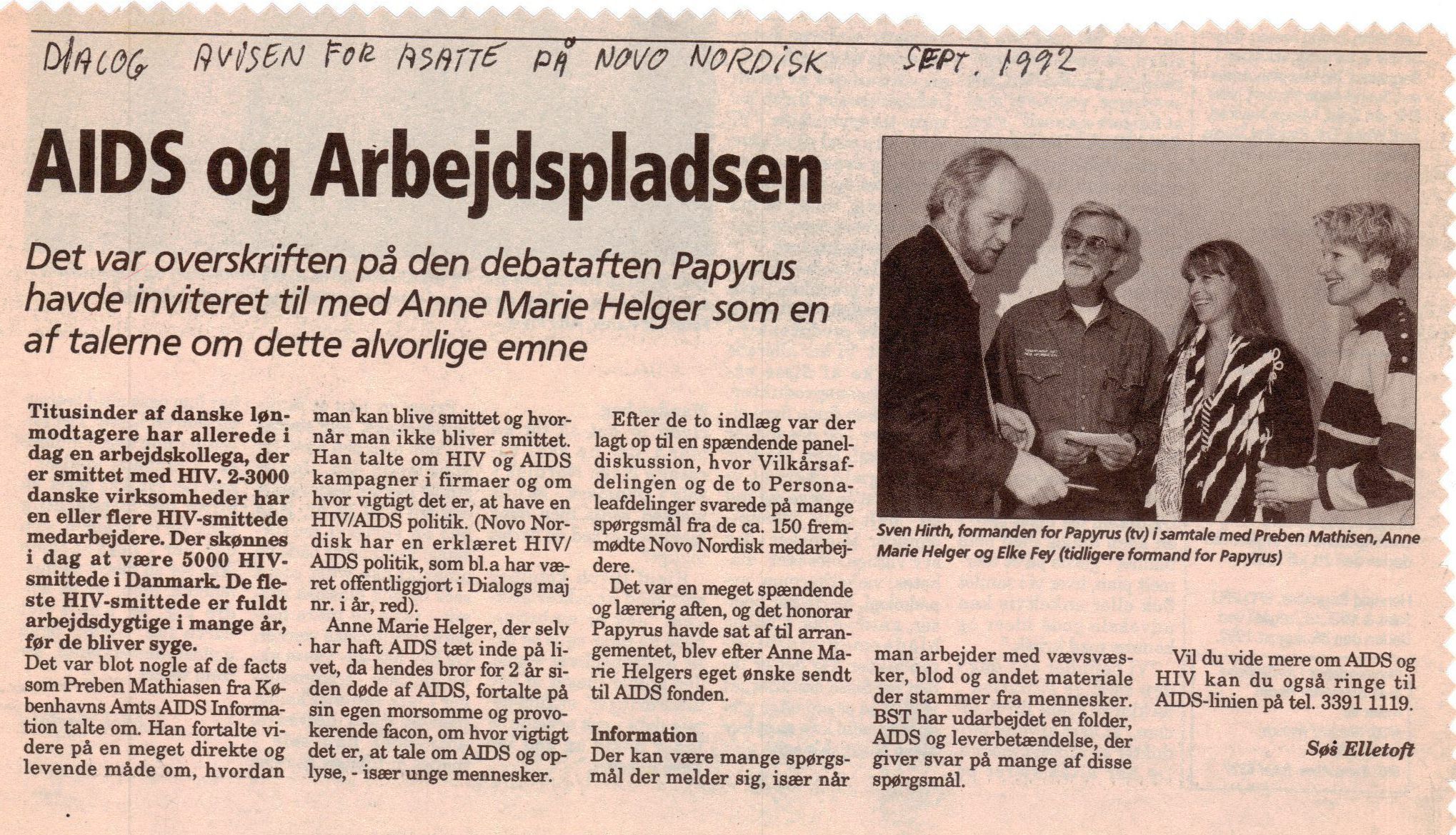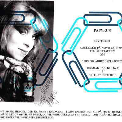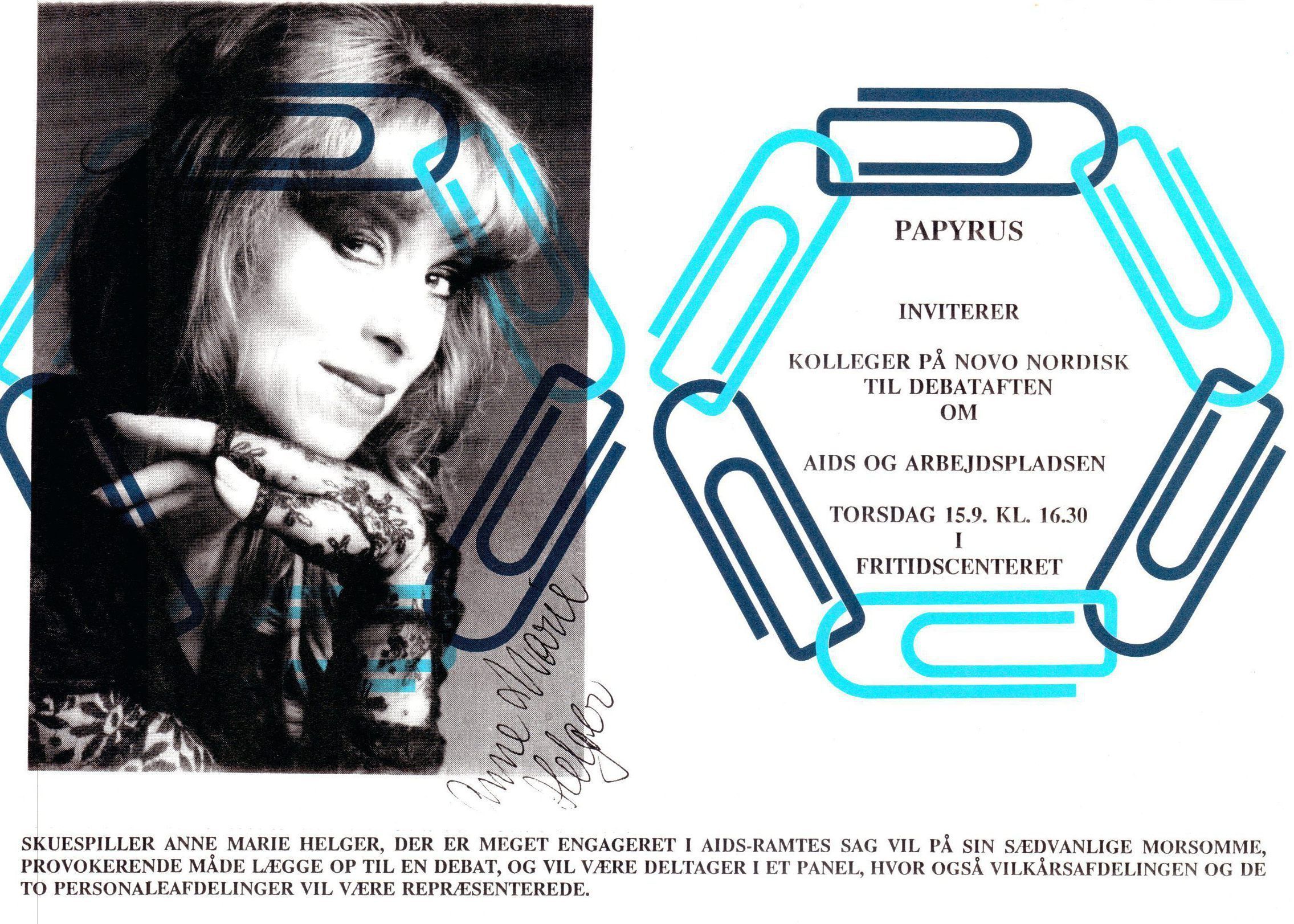 I mappen ligger også intern post fra Papyrus til Anne Marie Helger, og en beskrivelse af Novo Nordisks HIV/AIDS politik, med ID-numrene: DanKost#2023.12c-dCreated By