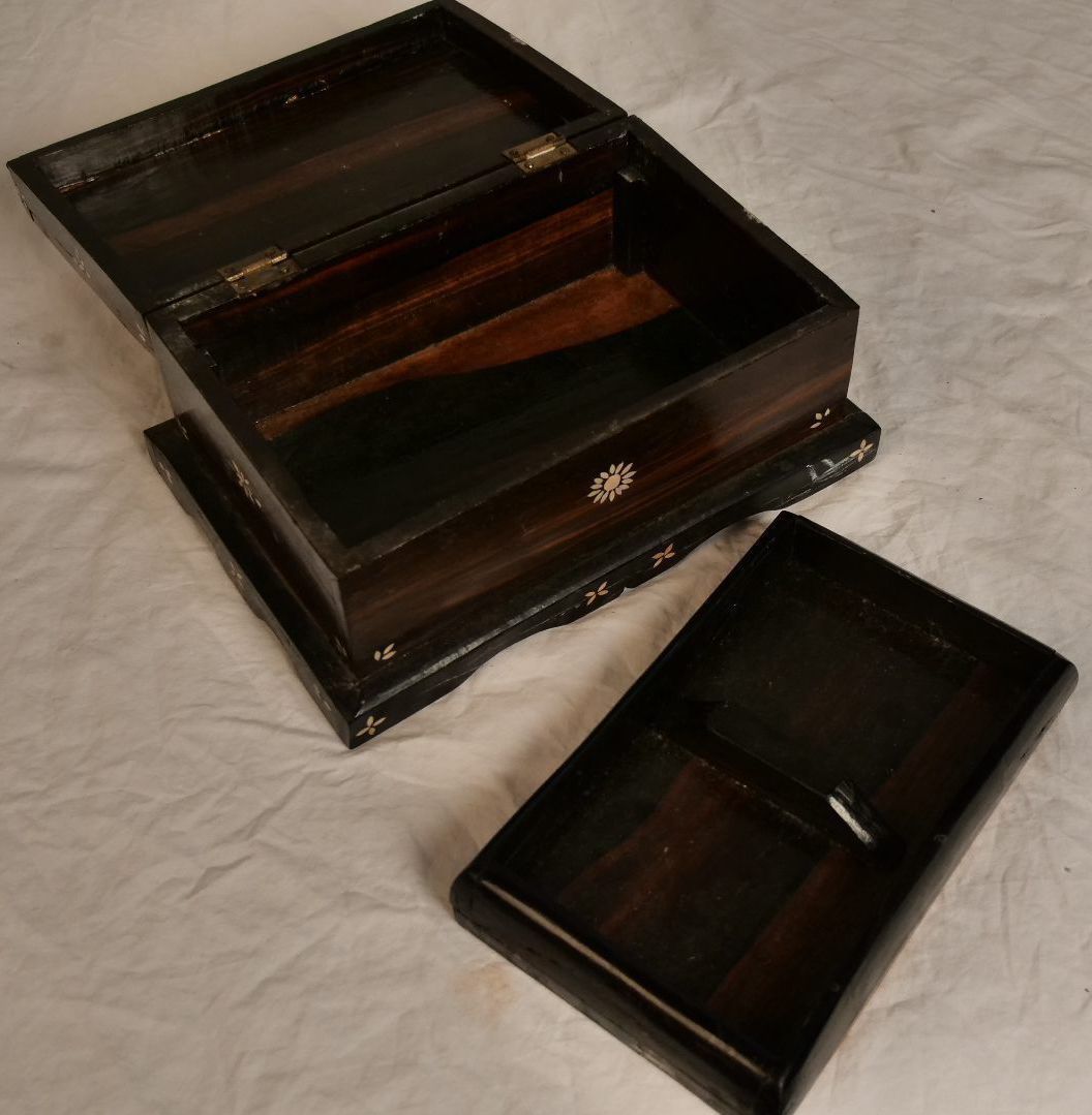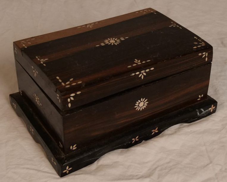 Wooden lidded box with decorative shell inlay. Removable wooden tray inside